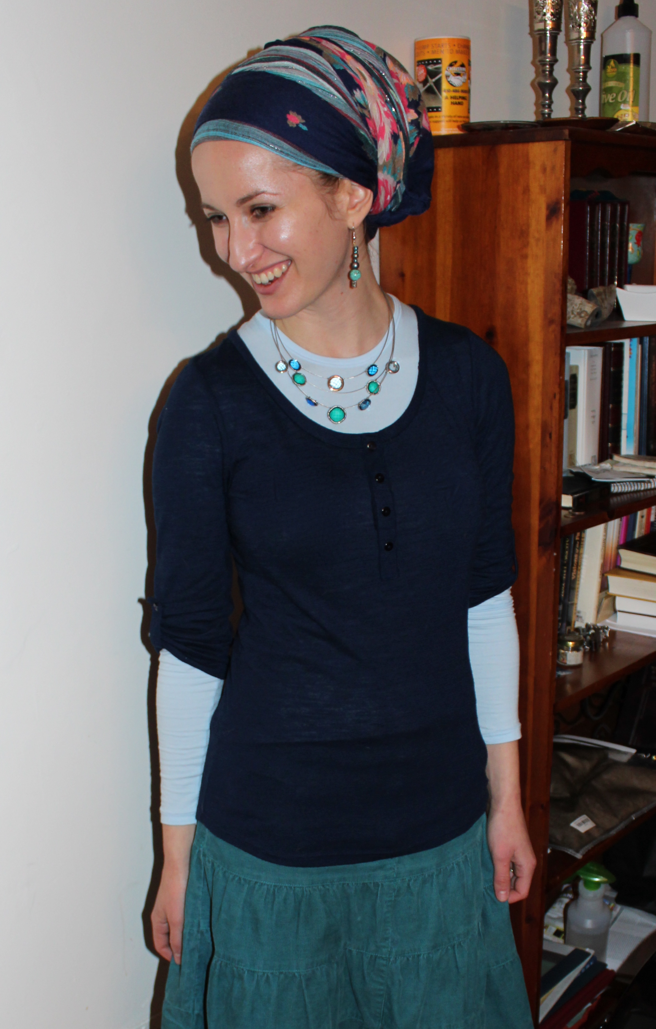 Since I’ve recently started covering my hair, I’ve started to actually put thought into my clothes. Before now, much to my Ima’s everlasting dismay, I just picked clothes that were modest enough, and also didn’t make my texture defensiveness activate. I’ve started to enjoy dressing up my tichel, though, and find myself accidentally becoming a little more coordinated! I put on a purple scarf with a brown one and think, oh! I have a sweater that matches! And oh! I even have some old earrings that I never sold that match! And then, POOF!, I’m successfully masquerading as an adult :P. This blog has been quite the inspiration for said masquerading.