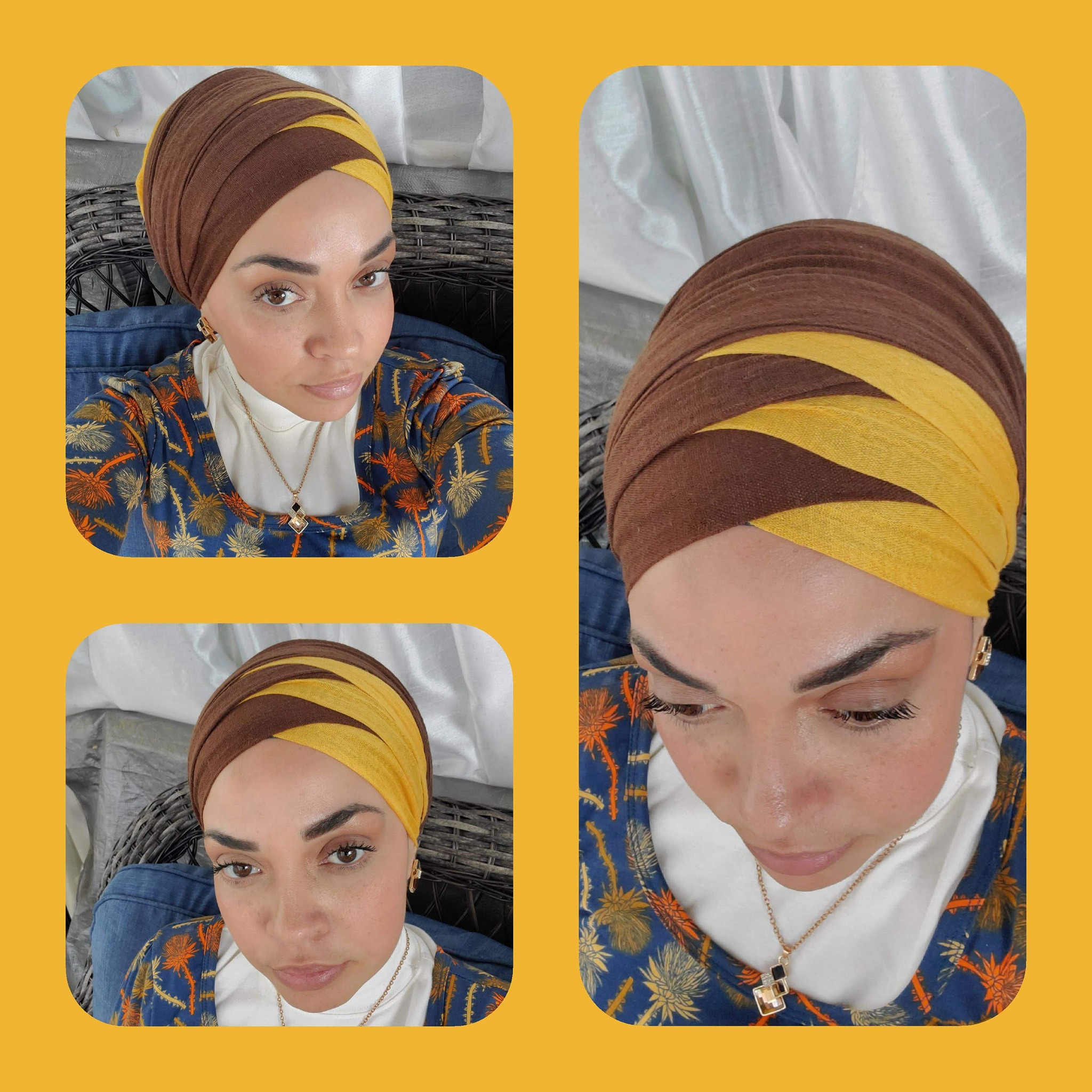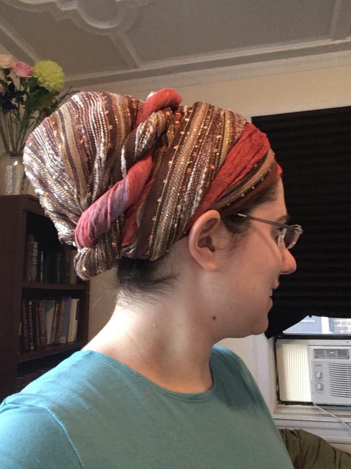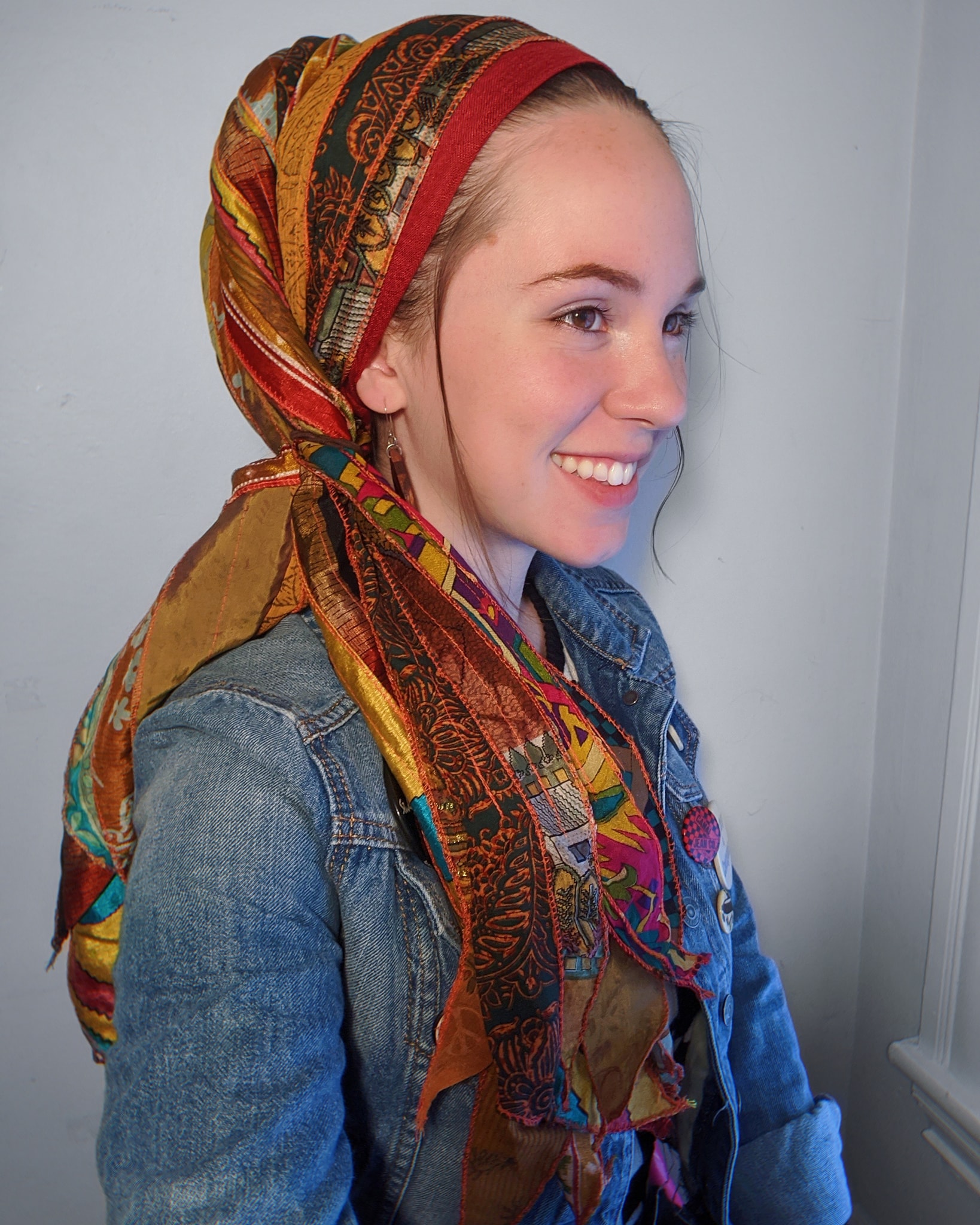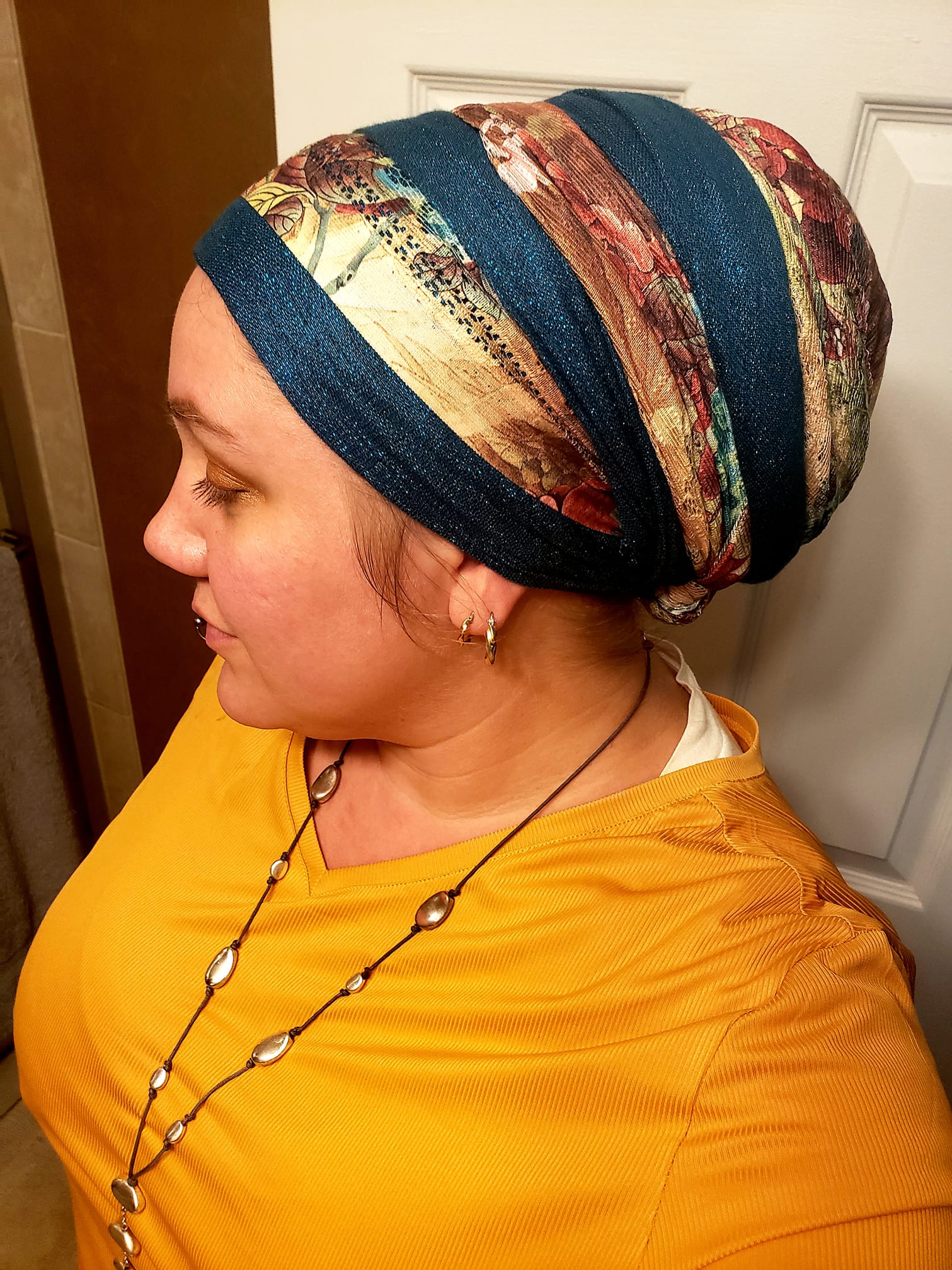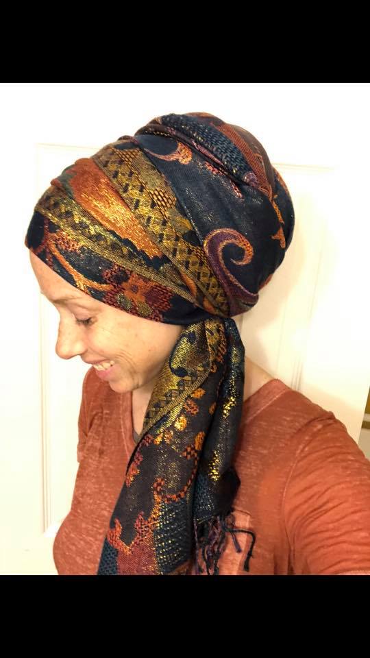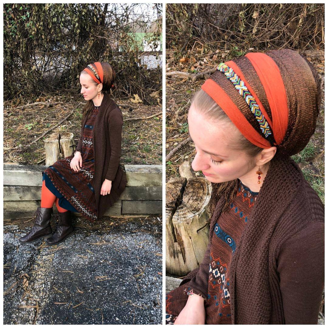 The heady heat of summer has given way to the cool, breezy days of autumn. Out come larger mugs for your hot beverages, warmer clothing and snuggly blankets and anything you can think of to layer – especially your scarves. Taking a stroll, you notice that things even sound different…there’s less automobile traffic and more sounds of squirrels scurrying to fill their burrows with acorns to fuel their winter’s nap. There are fewer puddle splashes from summer rains and more of the crisp crunching of leaves underfoot. You can breathe more deeply as you inhale the less humid air of autumn. You smile. So many of you can’t get enough pumpkin spice drinks and products, you wrap their colors on your pretty little heads instead. All is well. Add another layer of golden orange glory to your wrap and step out. Wrap an additional thickness of dark red or ochre yellow, or if you’re so inclined, capture the color palette of that lonely evergreen peeping out amidst the seasonal fire. No matter your fall fantasy, you’ll find it in the colors of the trees. Take a look at our incredible Wrapunzel Community Members and their gorgeously creative autumnal crowns 🙂