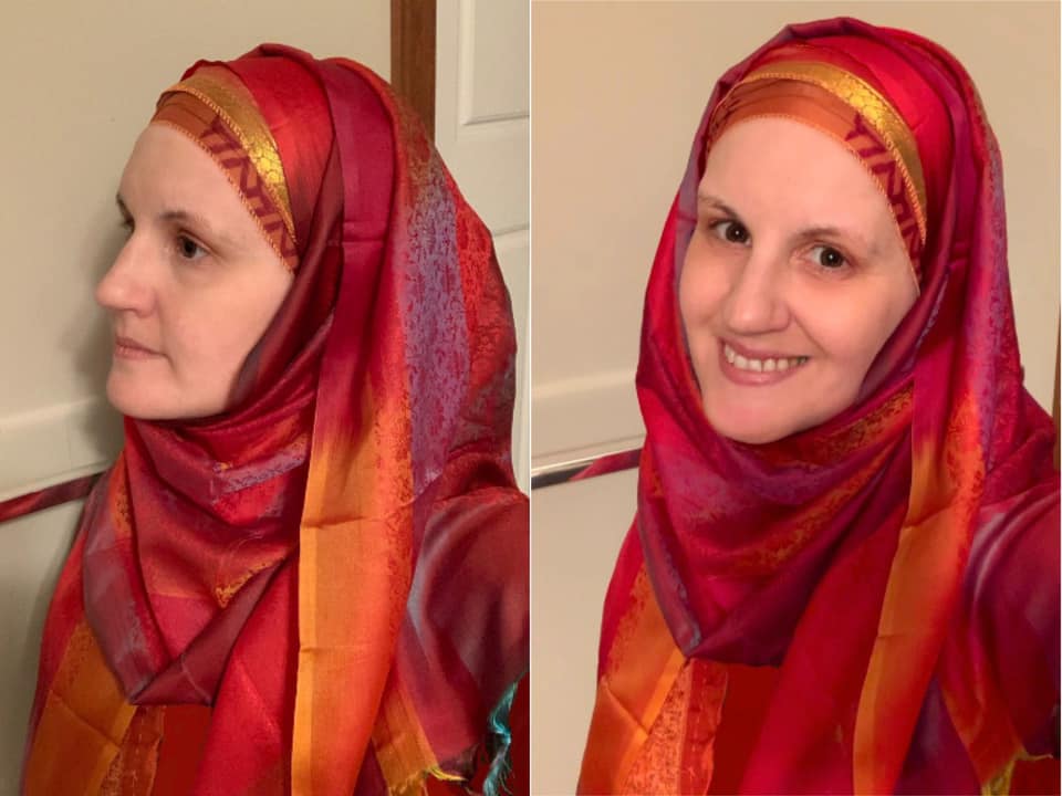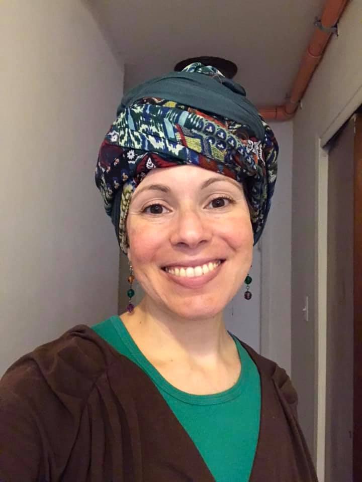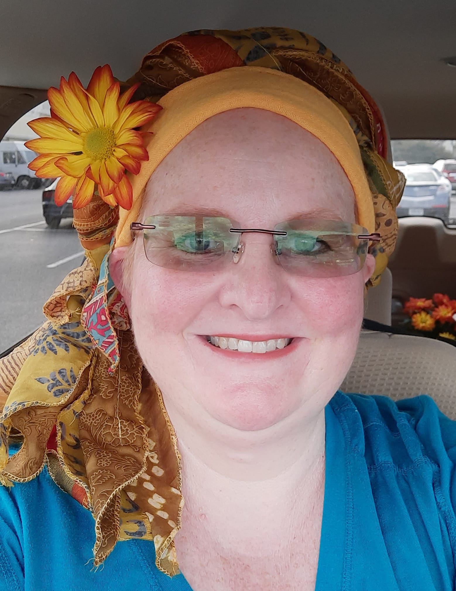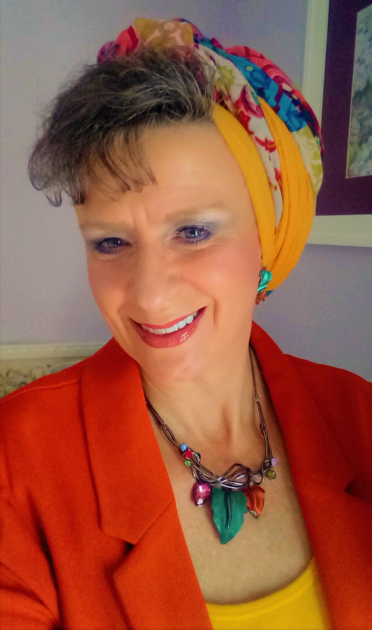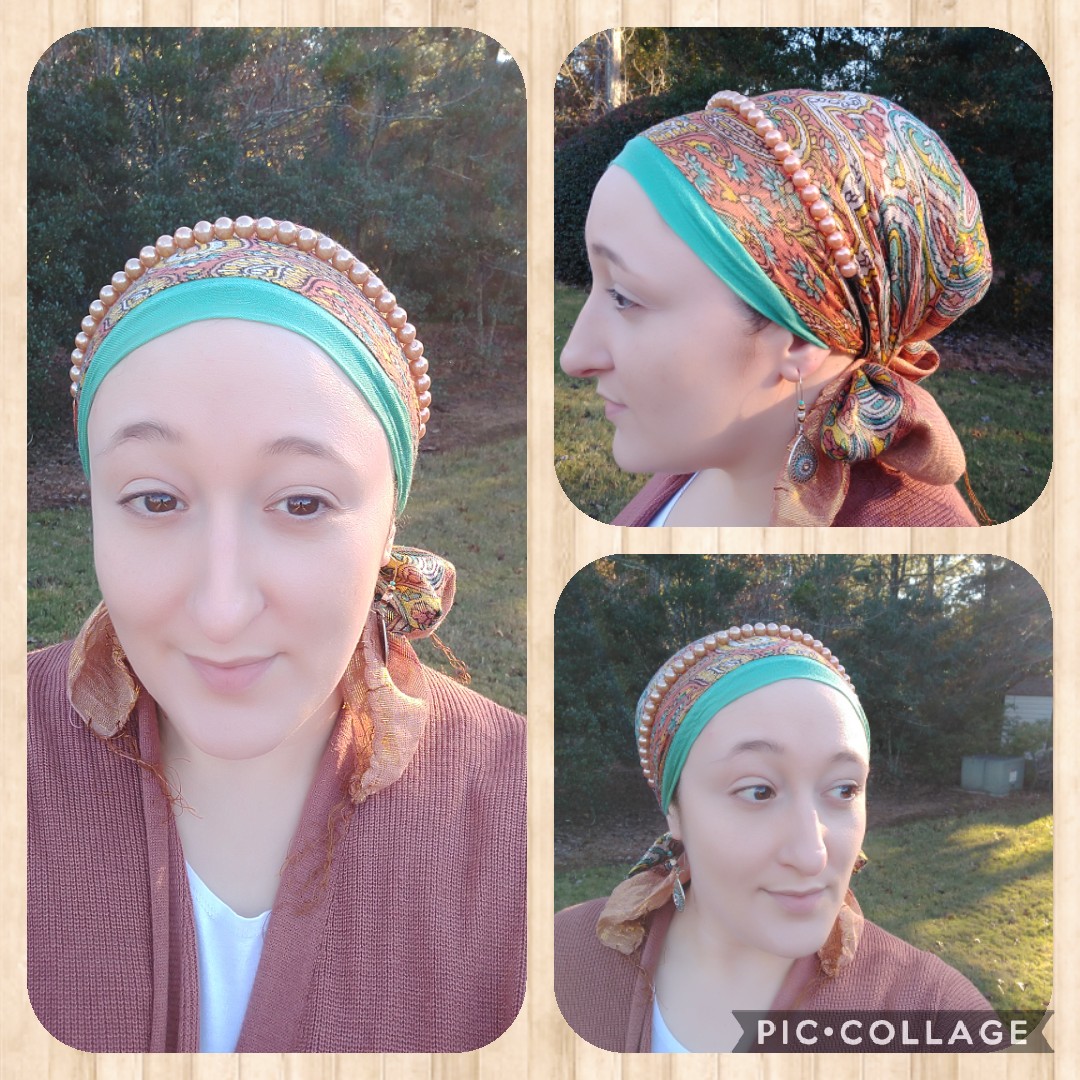 The heady heat of summer has given way to the cool, breezy days of autumn. Out come larger mugs for your hot beverages, warmer clothing and snuggly blankets and anything you can think of to layer – especially your scarves. Taking a stroll, you notice that things even sound different…there’s less automobile traffic and more sounds of squirrels scurrying to fill their burrows with acorns to fuel their winter’s nap. There are fewer puddle splashes from summer rains and more of the crisp crunching of leaves underfoot. You can breathe more deeply as you inhale the less humid air of autumn. You smile. So many of you can’t get enough pumpkin spice drinks and products, you wrap their colors on your pretty little heads instead. All is well. Add another layer of golden orange glory to your wrap and step out. Wrap an additional thickness of dark red or ochre yellow, or if you’re so inclined, capture the color palette of that lonely evergreen peeping out amidst the seasonal fire. No matter your fall fantasy, you’ll find it in the colors of the trees. Take a look at our incredible Wrapunzel Community Members and their gorgeously creative autumnal crowns 🙂