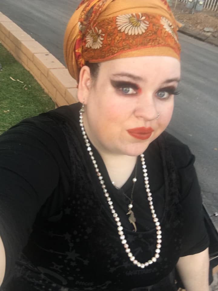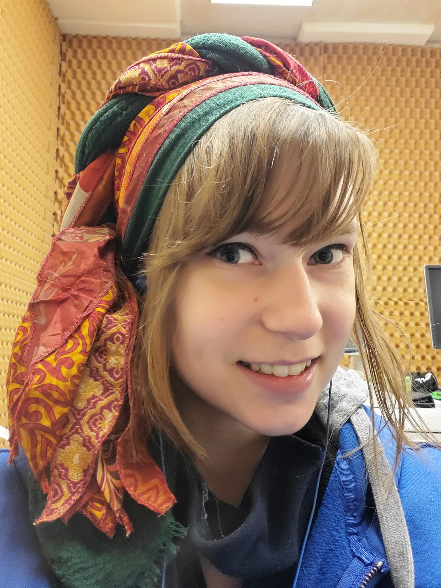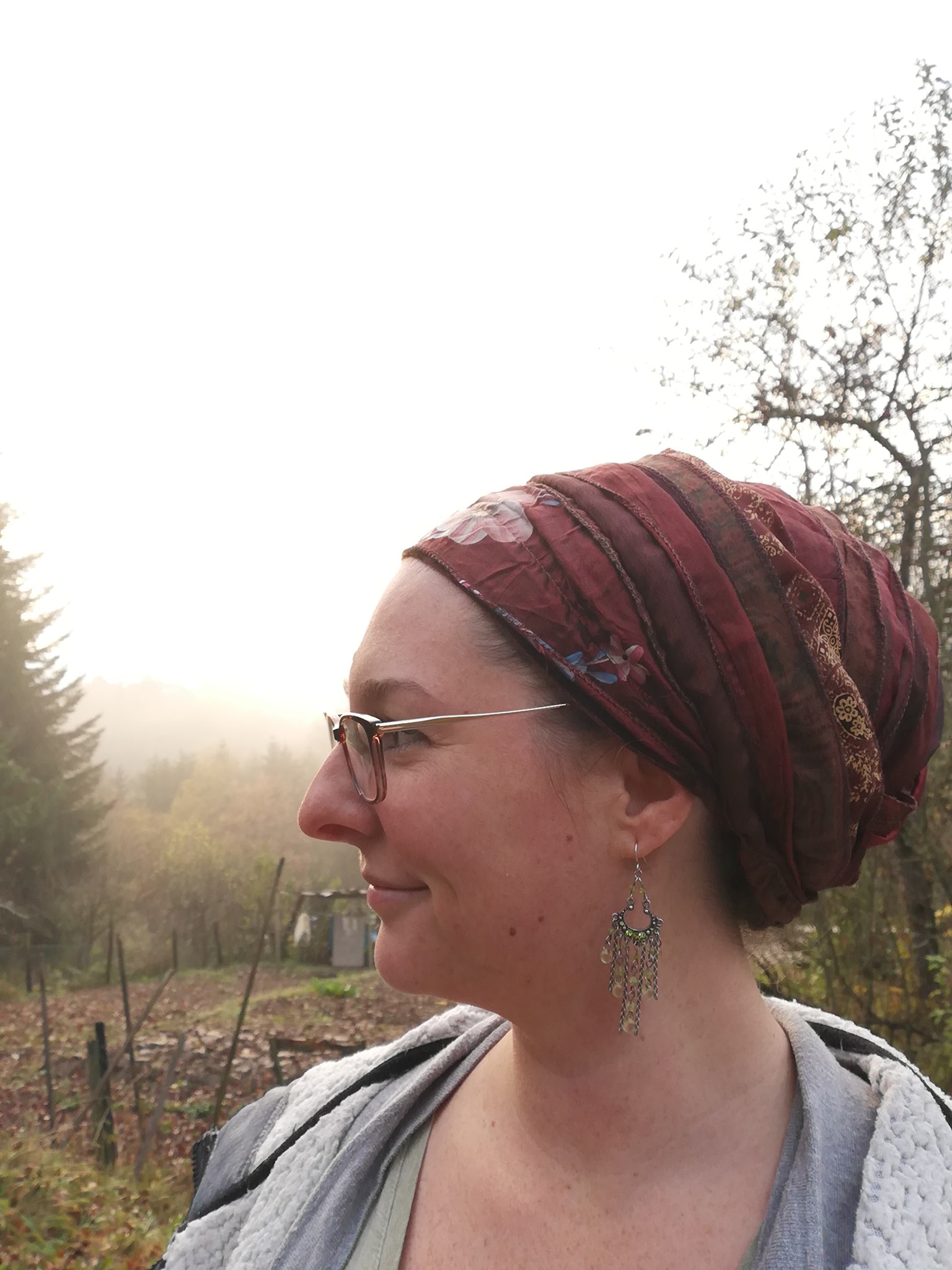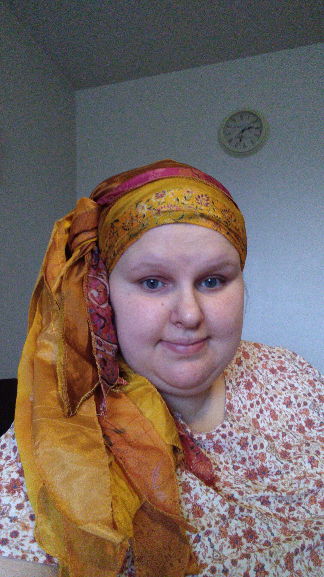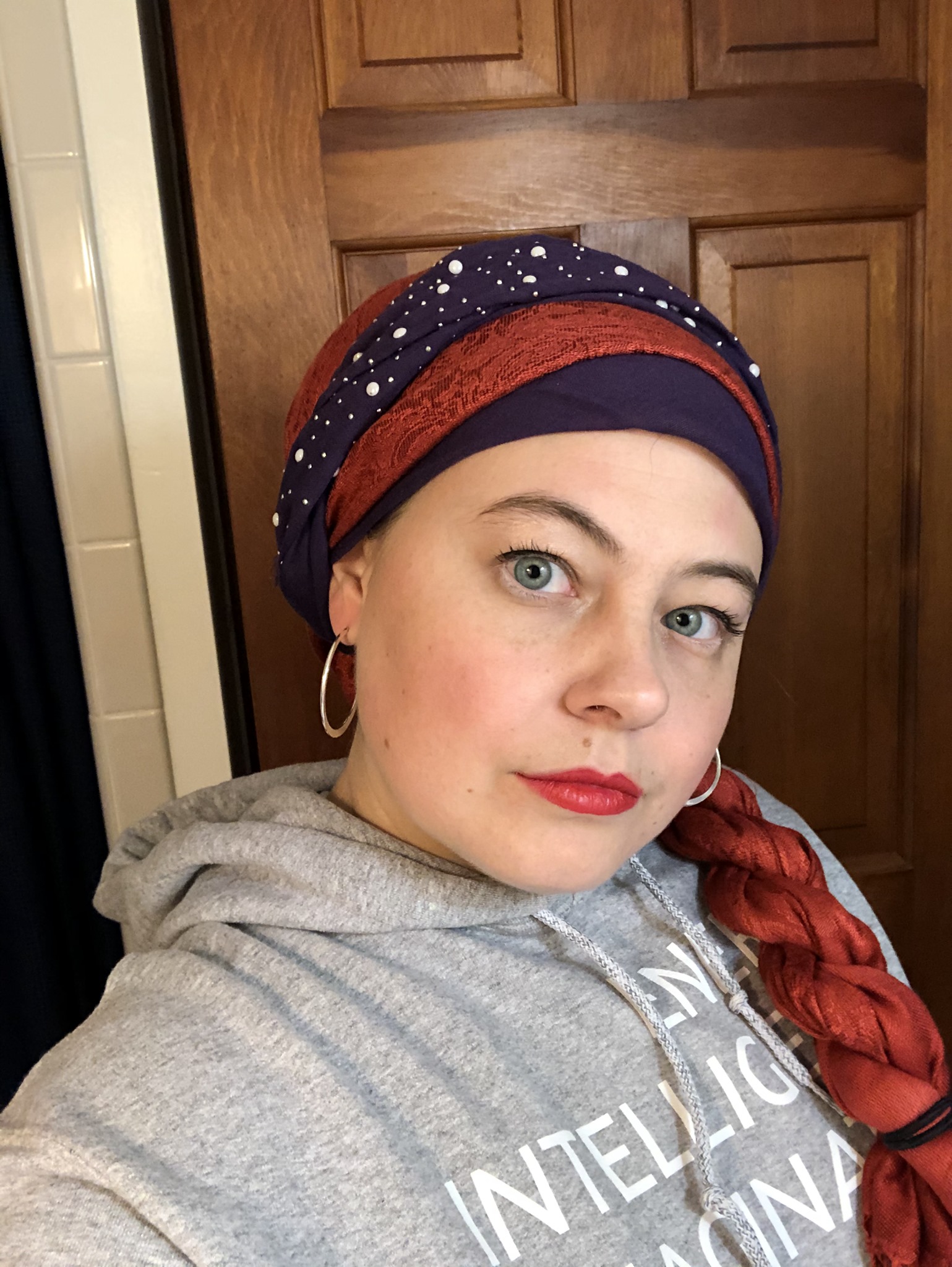 The heady heat of summer has given way to the cool, breezy days of autumn. Out come larger mugs for your hot beverages, warmer clothing and snuggly blankets and anything you can think of to layer – especially your scarves. Taking a stroll, you notice that things even sound different…there’s less automobile traffic and more sounds of squirrels scurrying to fill their burrows with acorns to fuel their winter’s nap. There are fewer puddle splashes from summer rains and more of the crisp crunching of leaves underfoot. You can breathe more deeply as you inhale the less humid air of autumn. You smile. So many of you can’t get enough pumpkin spice drinks and products, you wrap their colors on your pretty little heads instead. All is well. Add another layer of golden orange glory to your wrap and step out. Wrap an additional thickness of dark red or ochre yellow, or if you’re so inclined, capture the color palette of that lonely evergreen peeping out amidst the seasonal fire. No matter your fall fantasy, you’ll find it in the colors of the trees. Take a look at our incredible Wrapunzel Community Members and their gorgeously creative autumnal crowns 🙂