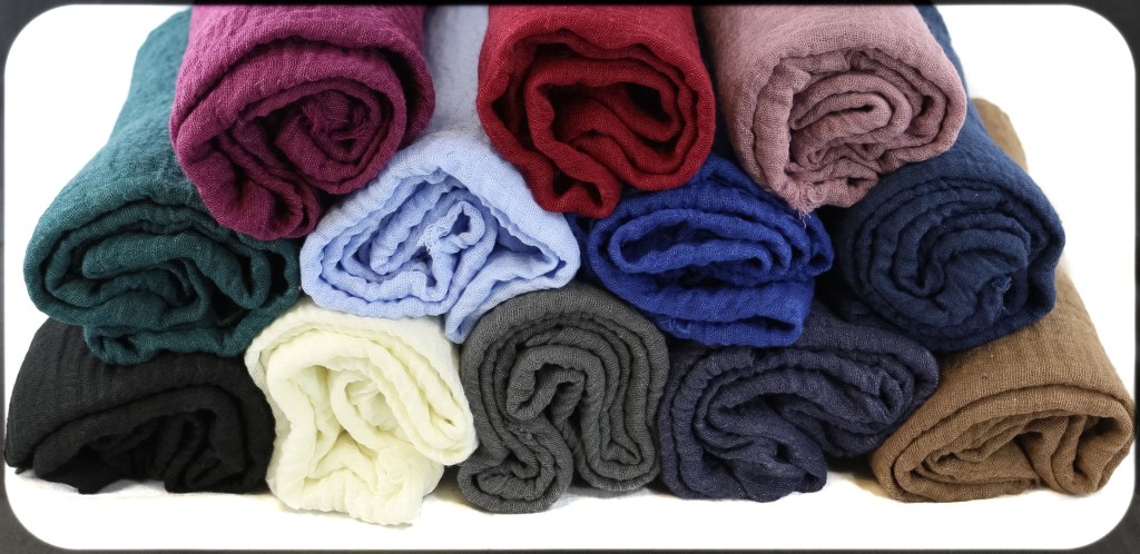 1. The Petalsoft Scarf – This supersoft, billowy and lightweight scarf came to mind for us faster than any other. It’s got a gauzy texture, with little ripples that ‘give’ to the touch (these ripples will not prove too stimulating). The Petalsoft Scarf comes in a wide variety of colors, including some ‘dustier’ shades that won’t prove overpowering in brightness. This scarf is solid-colored, very easy to wrap and has a gently frayed edge that doesn’t unfurl. Grab this one first – you’ll love it!