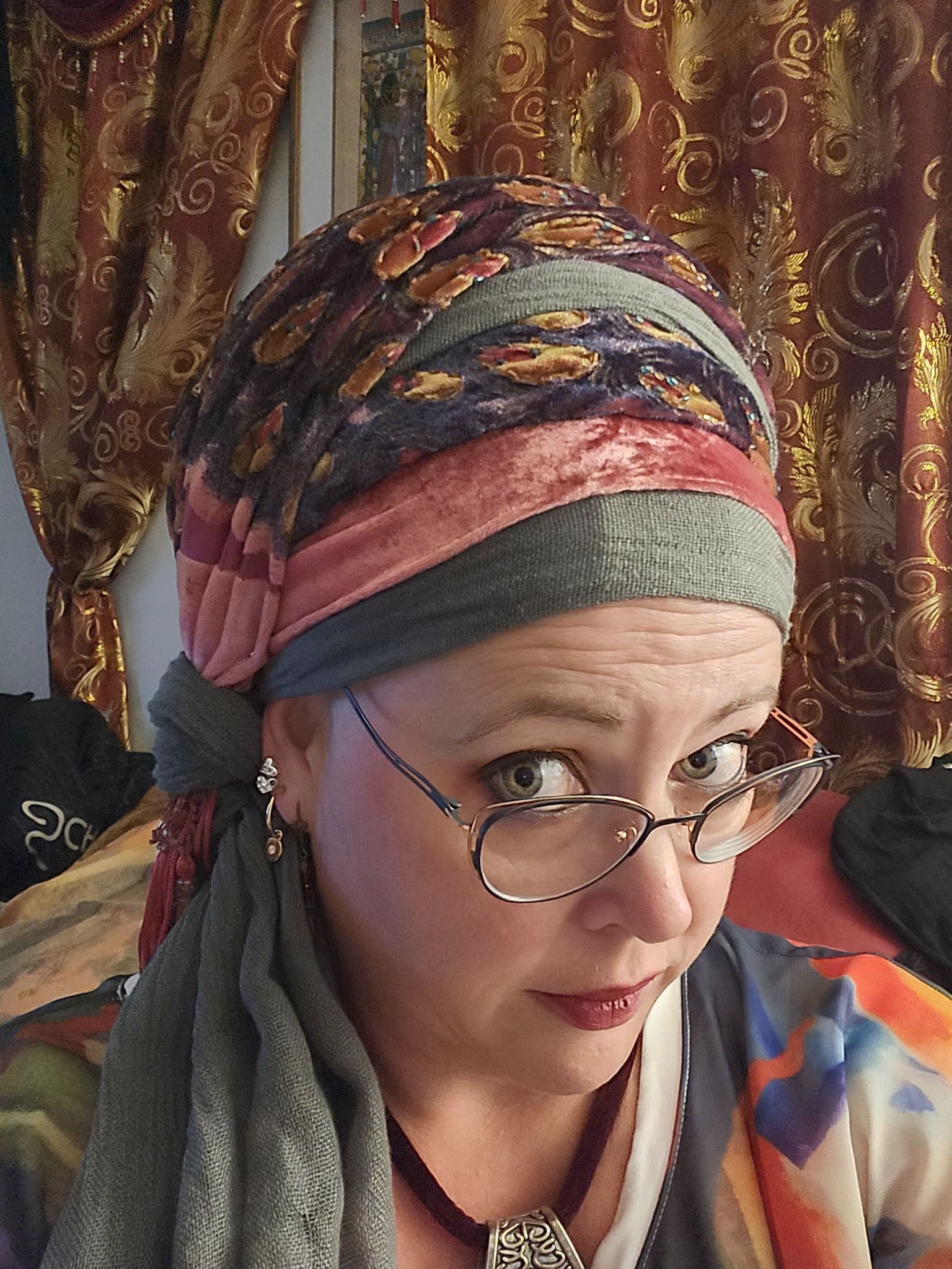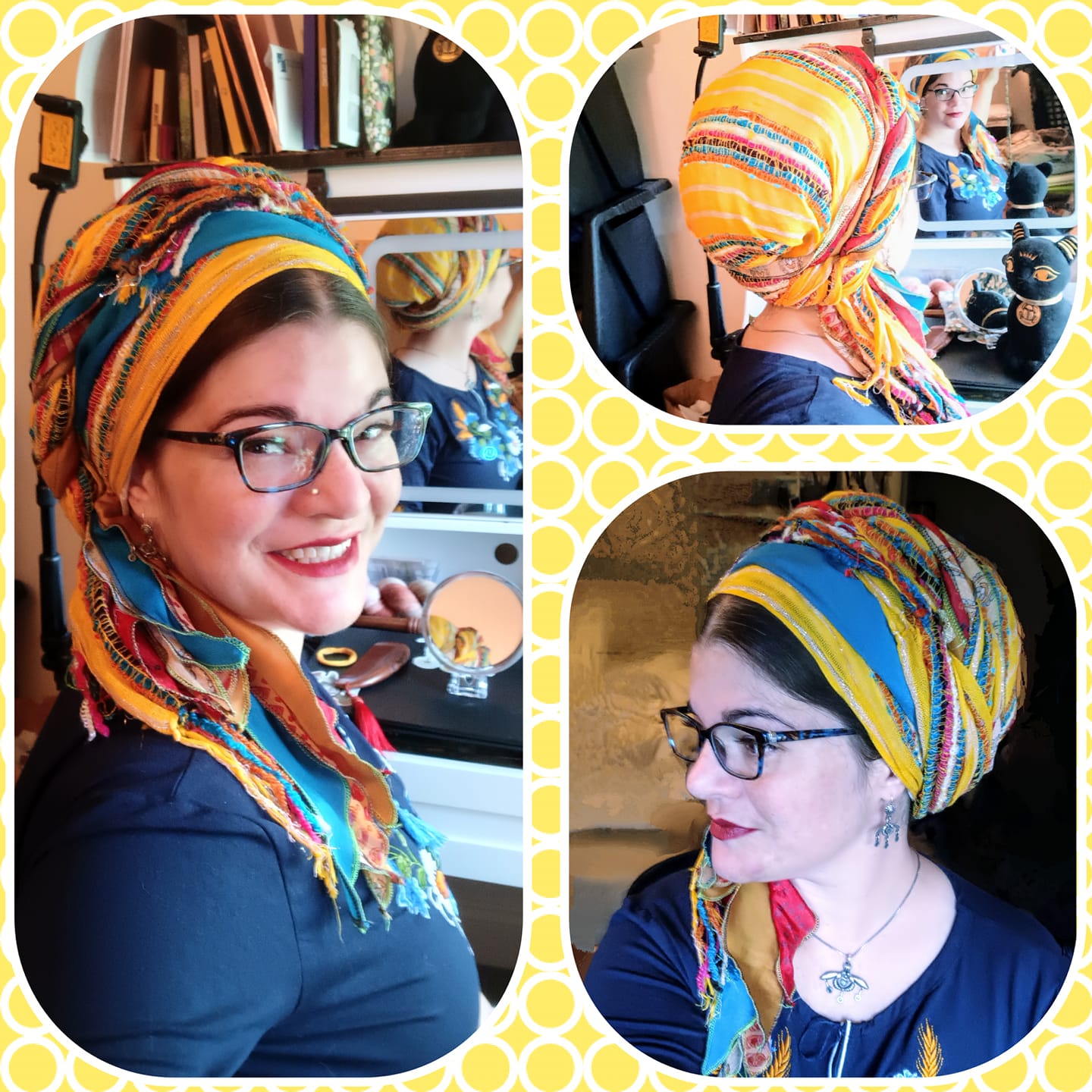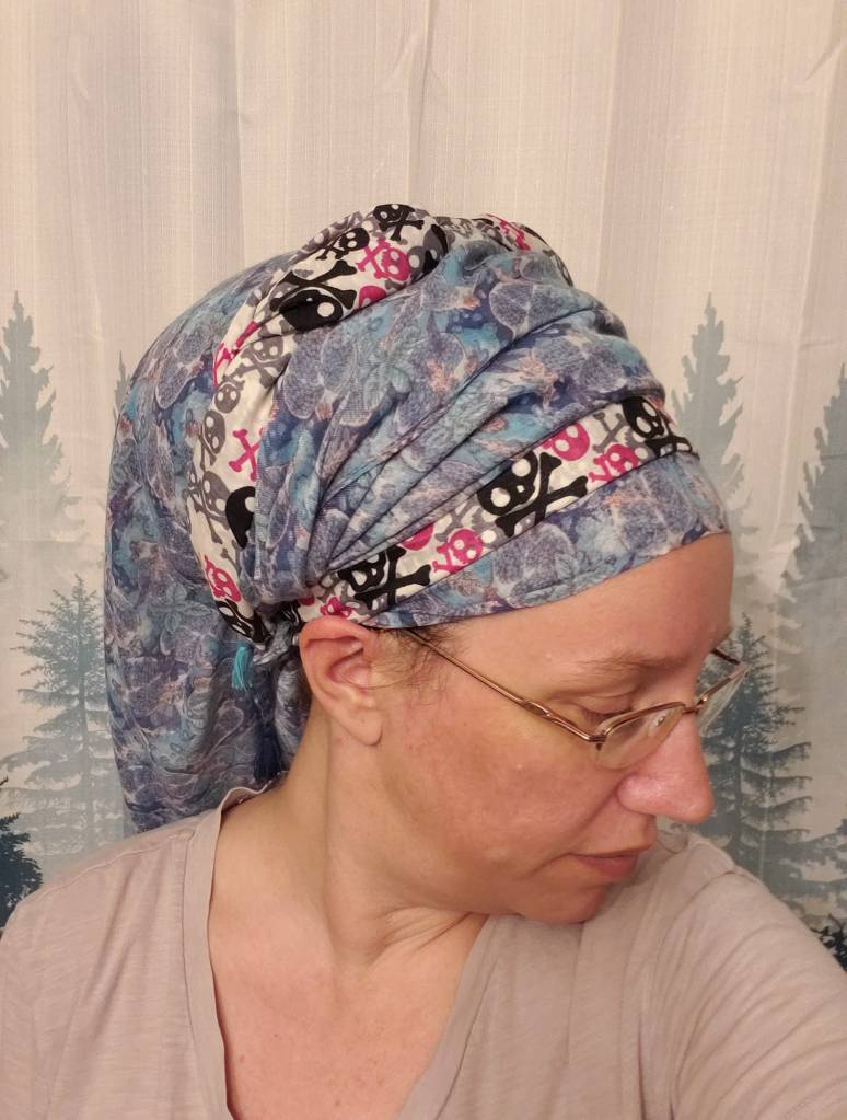 Wednesday – ‘Hump Day bumpkin for the day of the week challenge! Minimal effort here, basic kerchief tie Rainbow Threads Israeli Tichel on a 1/4 stuffed Cloud9 Shaper. It looks like a lot more art than it is!’