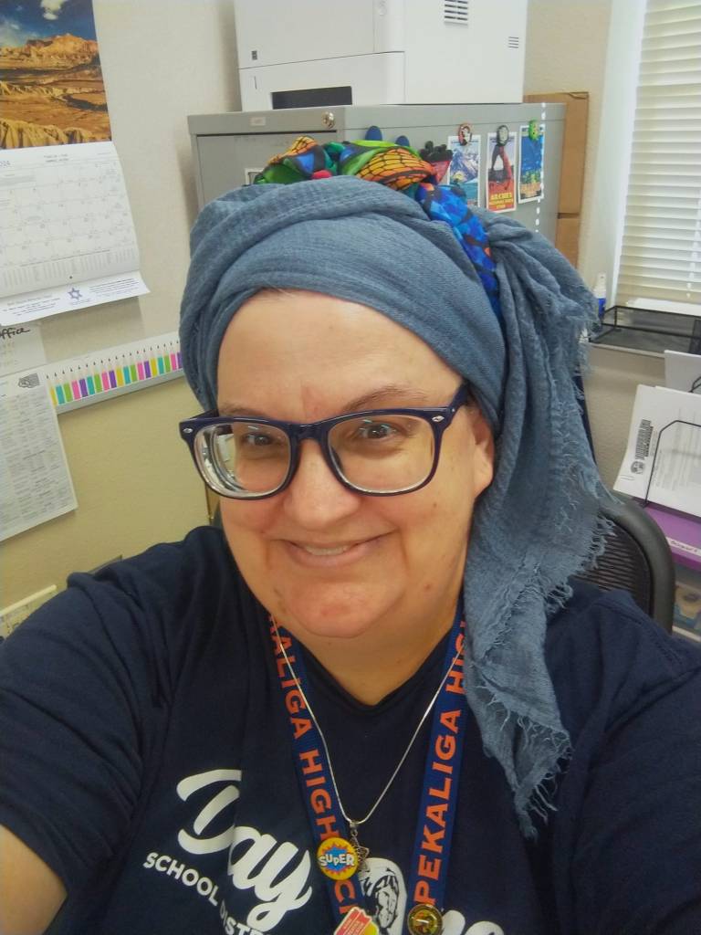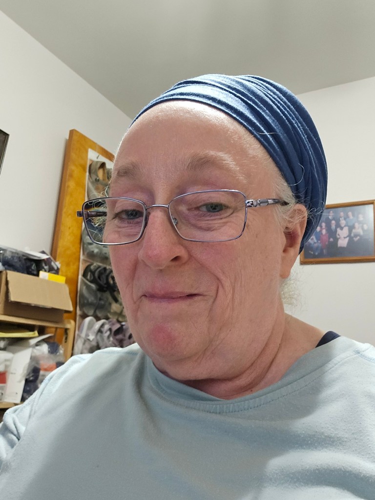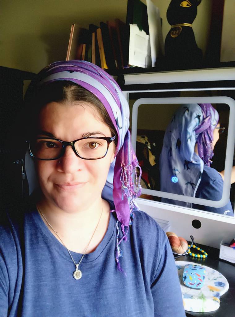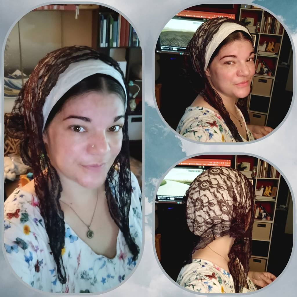 Sunday – ‘An heirloom with my grandmother-in-law’s church mantilla over a White Israeli Tichel with Silver threads and a Cloud9.’