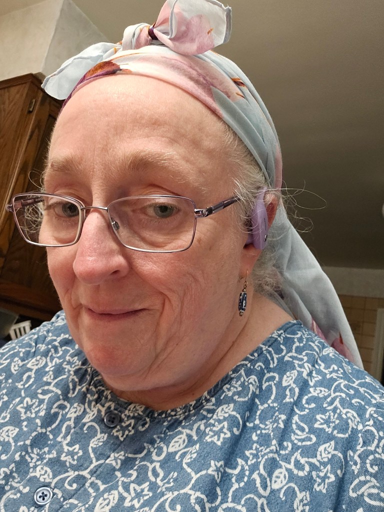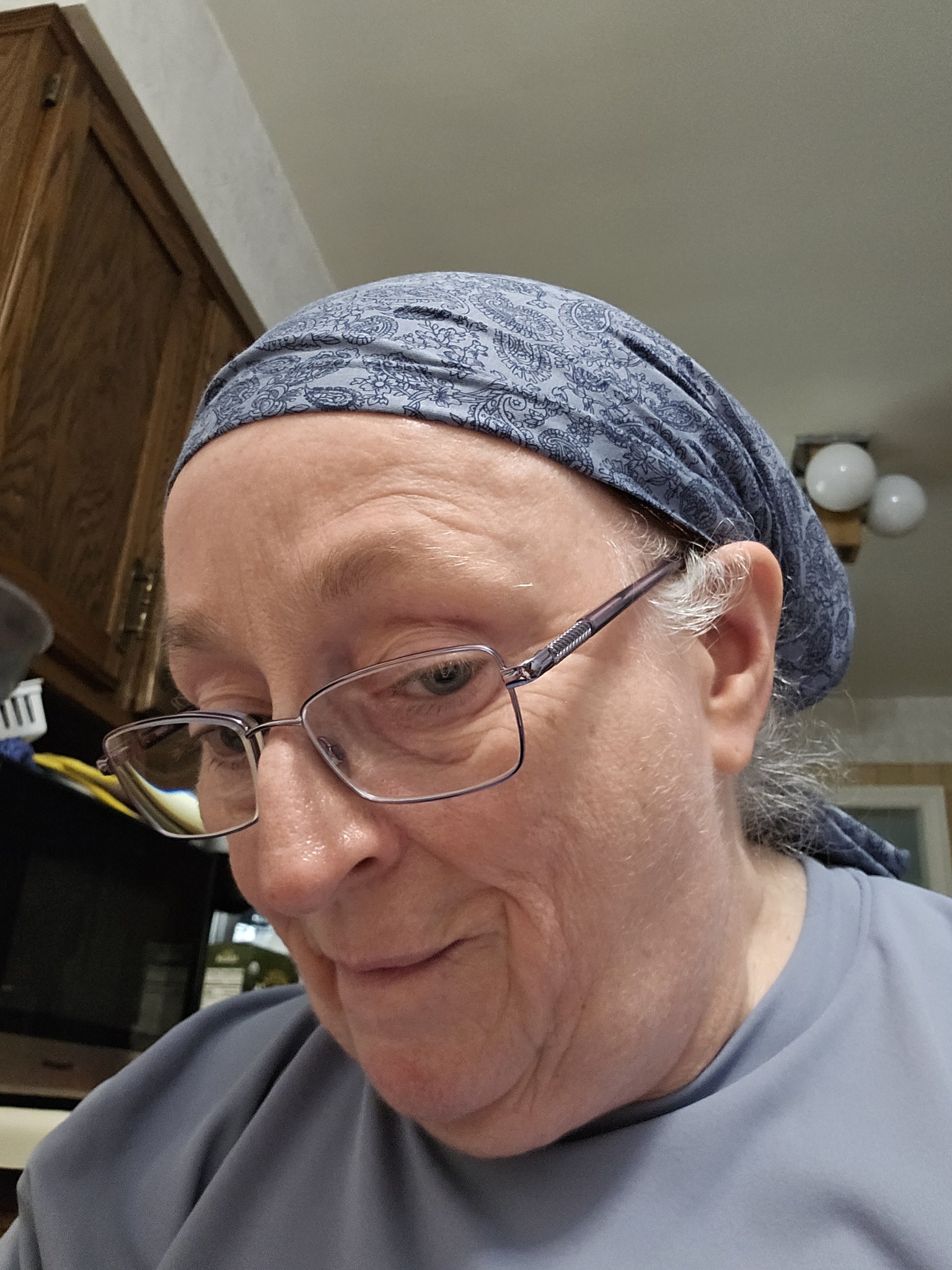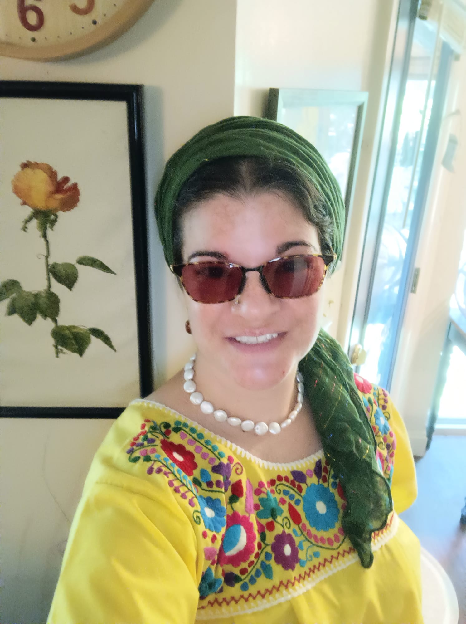 Sunday – ‘An heirloom with my grandmother-in-law’s church mantilla over a White Israeli Tichel with Silver threads and a Cloud9.’