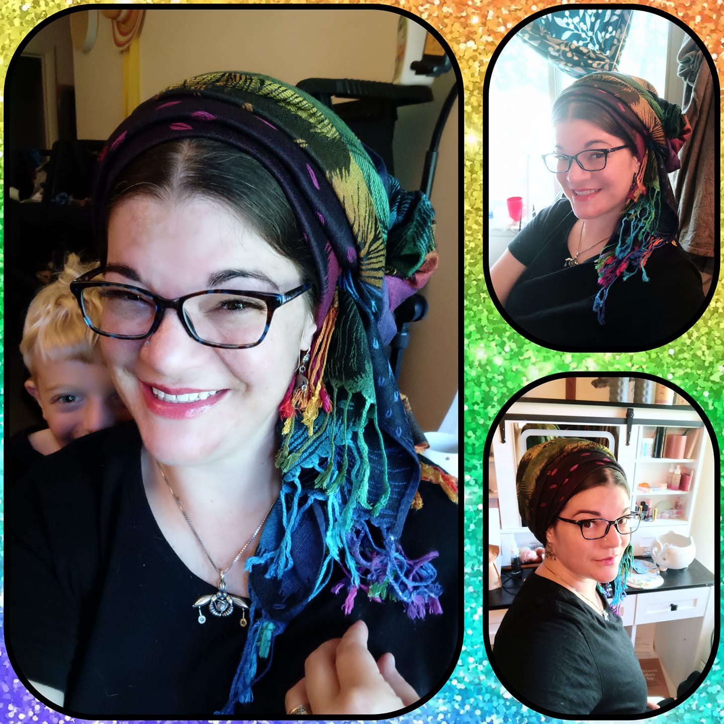 Saturday – ‘Getting photo bombed by my child, who is a very silly little guy. This pashmina (Take Flight in Black) is basically sweatpants for your head.’