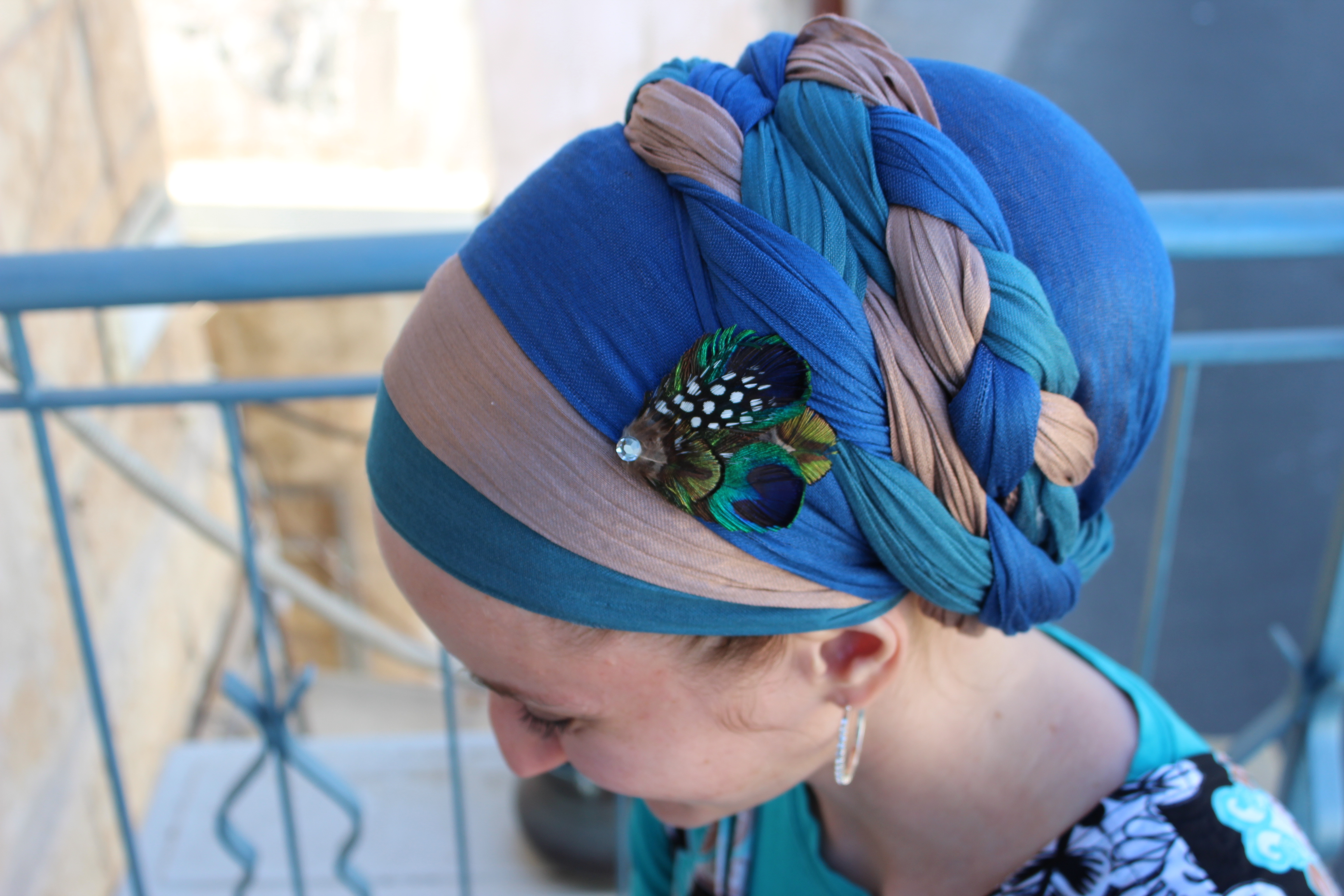 Now check out the next one we did! I decided that I wanted to try the height at the top too… but made sure that I extended it around the sides as well which worked beautifully! I really should wear this Lakeshore Bliss tichel more often! Naomi Rose looks ethereal and earthy in her Peaceful Mornings and Gold Roses headband tied in the Shira Tails style!