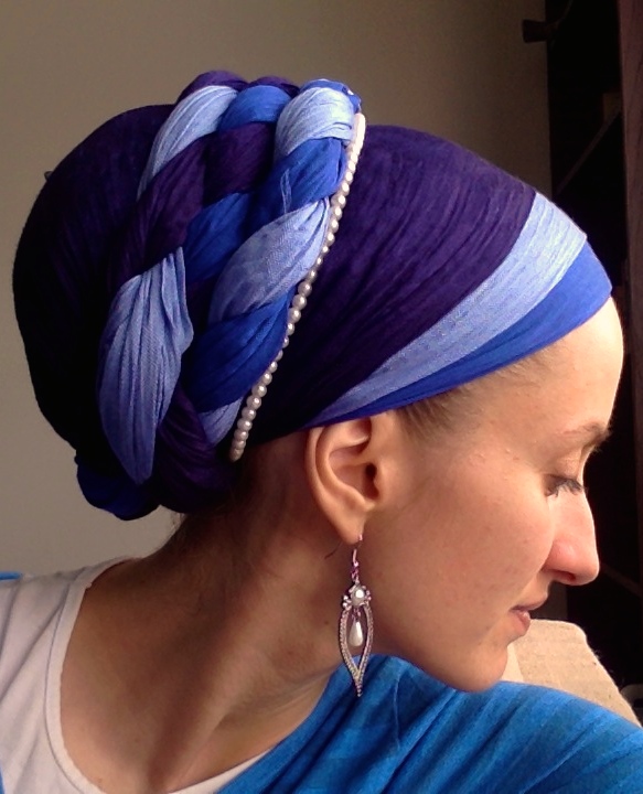 In the photo above, you can see how Naomi Rose has highlighted her beautiful face shape with a wrap that give height at the back and not the sides. And of course the teal and wine combo is just sumptuous! (She’s wearing a Trust and Sari Scarf.) I decided to go Shimmerycrazy with some side volume, angles (but not too angled because my face can’t take it!) and a side braid! Loved this!