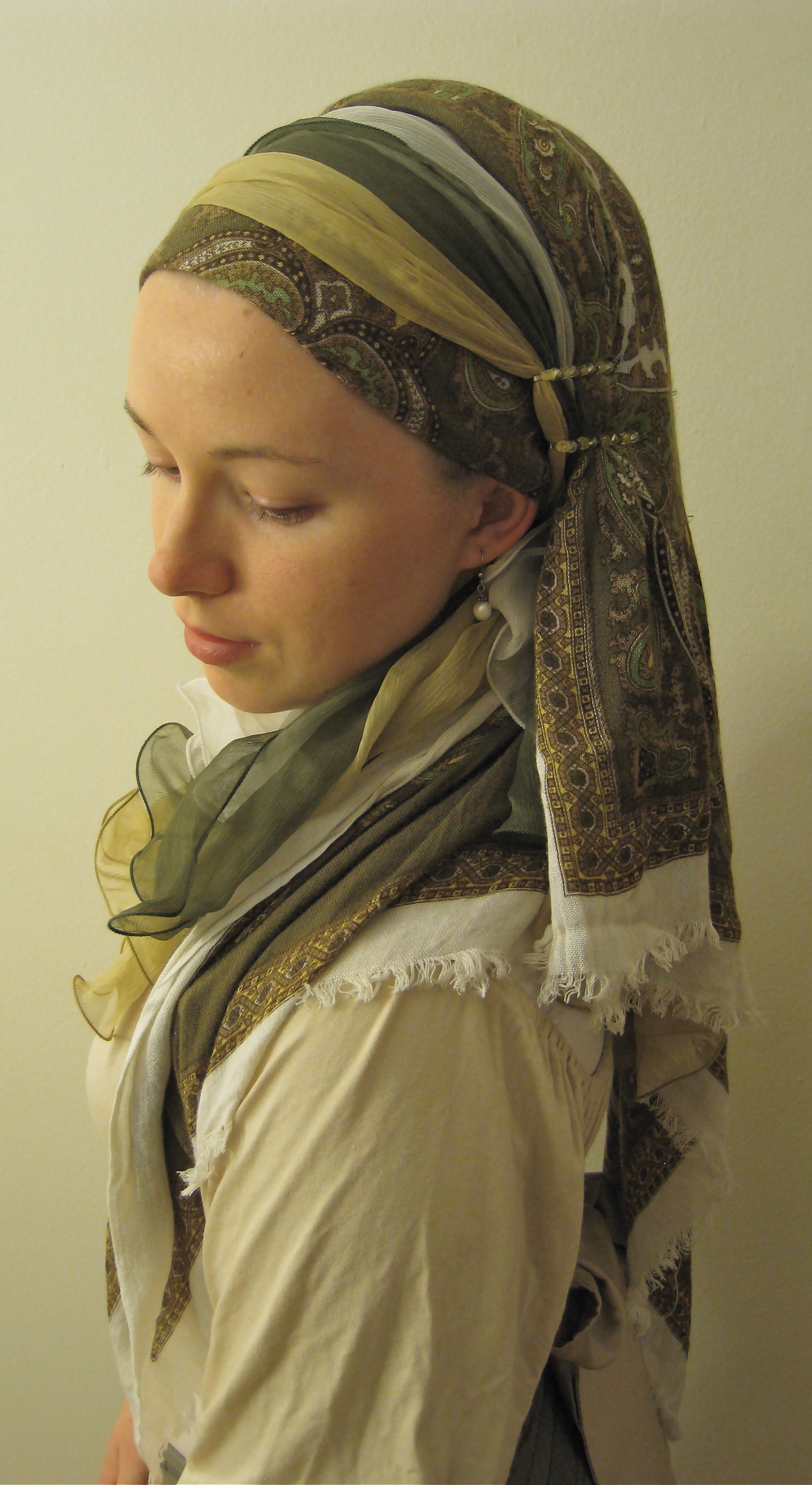 I suppose you could say I heard a call, not with my ears, but with my heart. I don’t believe it was a call from a Deity, personally, but more of my own desire to acknowledge something beautiful within myself. Right before, though, another group that I’m in had a couple of girls who decided to try and cover during domestic duties. They began to ask me about it. That reaffirmed my desire to start covering again. I cover every day, even at home, as it keeps me from sweeping up hair all the time and pulling my hair as well. Plus, it makes me feel gorgeous, and since it sits on my head, it keeps me mindful of things. It reminds me to use my head when I would rather use my heart when reacting to things. I am a very emotional person, and I have issues with anxiety and my tichels and headcovering practice helps me deal with it by giving me something to focus on rather than what is causing my anxiety. It also reminds me that I am a QUEEN – and I mean capital Q-U-E-E-N! I use that term to remind myself that I am in control of myself, my body, my mind, my spirit, my entire being. My tichel is my crown, and now my husband is on board with me covering (as he put it, it’s my head and he would love me no matter what). I love discovering new combinations, new ways to tie. I even made a tie myself, that was inspired by The Girl with the Pearl Earring painting.