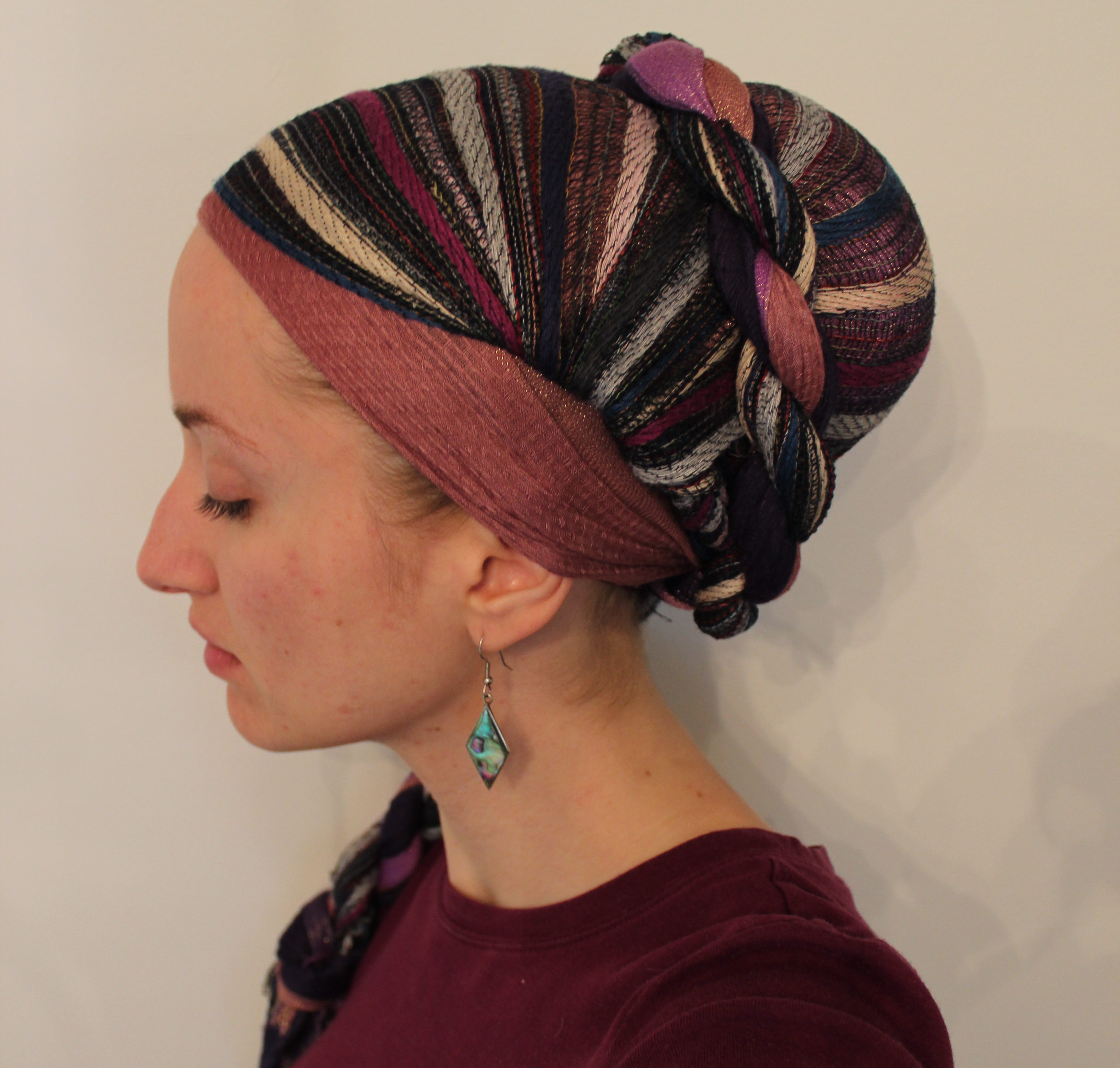 3) You might want to buy a volumizer, a padded cotton cap that goes under the tichel and gives a fuller look (as if you have scads of thick beautiful hair underneath!).