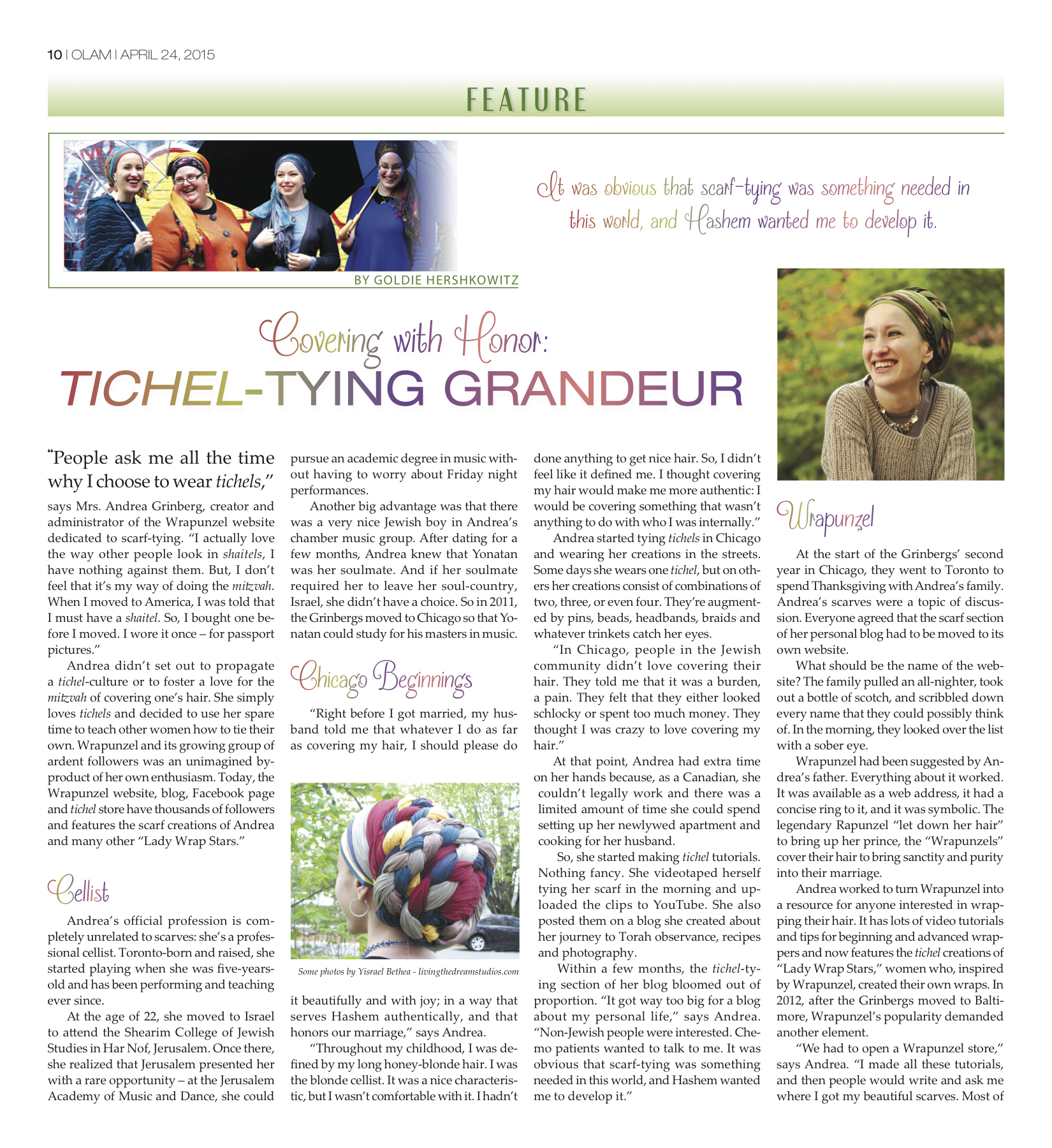 But you don’t have to be Sephardic—or even Jewish!—to appreciate the possibilities of tichel-wearing, or “wrapping,” as Andrea Grinberg and Rivka Malka Perlman like to call it. These two friends first connected online through their shared loved of creative tichel wearing. Andrea, a professional cello performer and teacher, as well as an inspired baalas teshuva, had started a blog with the charming name “Wrapunzel,” in which she documents her own discoveries and inventions with tichels and invites other women to share theirs.