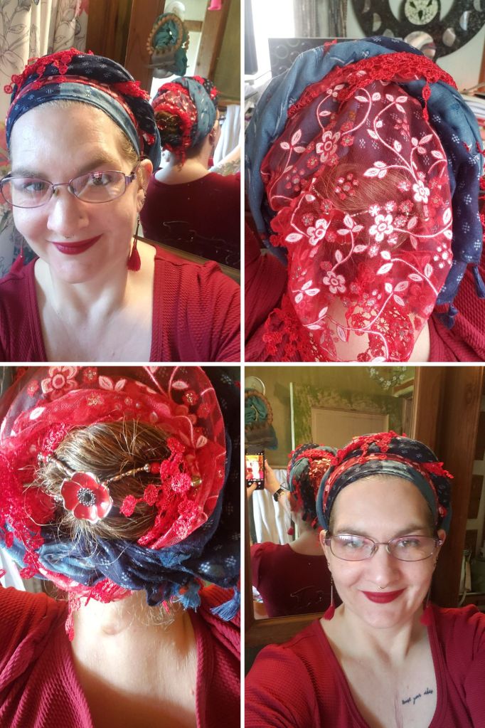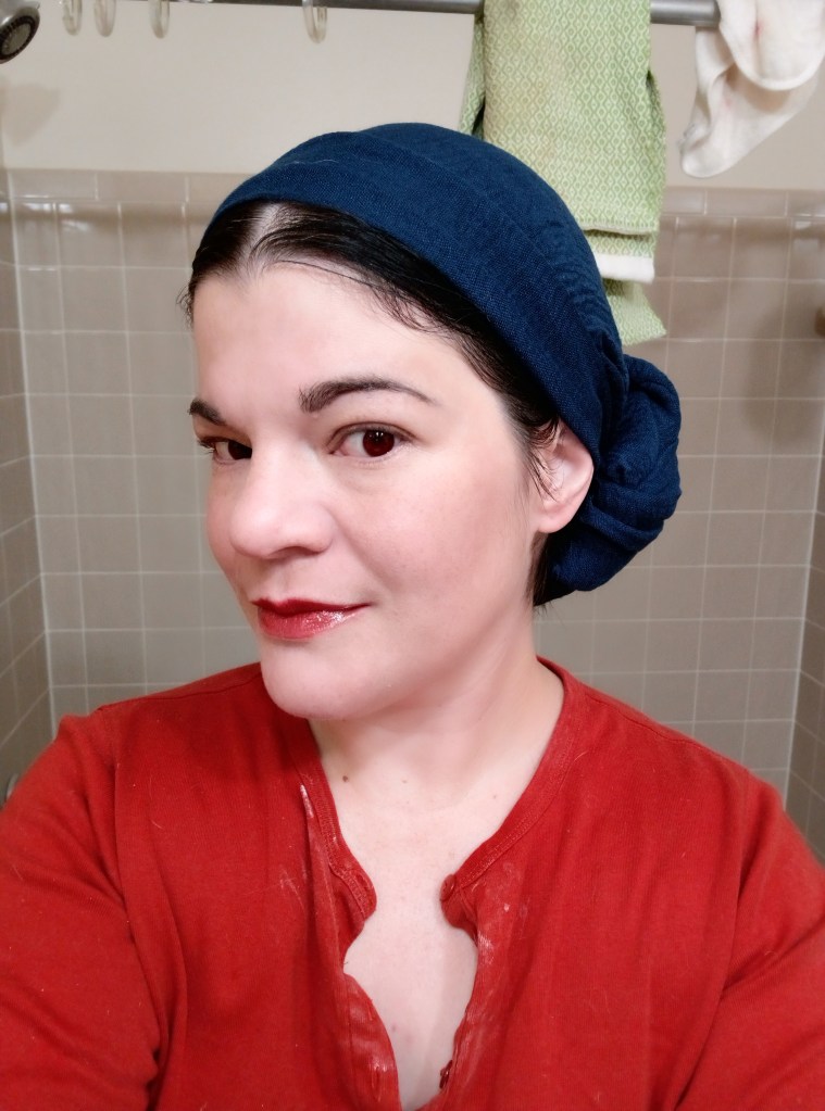 This was a bad tichel day! I wanted a tidy twist crown with tucked ends. I got a pouffy, slithery eldritch horror trying to make me look like an Italian renaissance painting about lazy nobles and their bad turbans. All I need is a derpy pet ermine. I never did get this one to work.