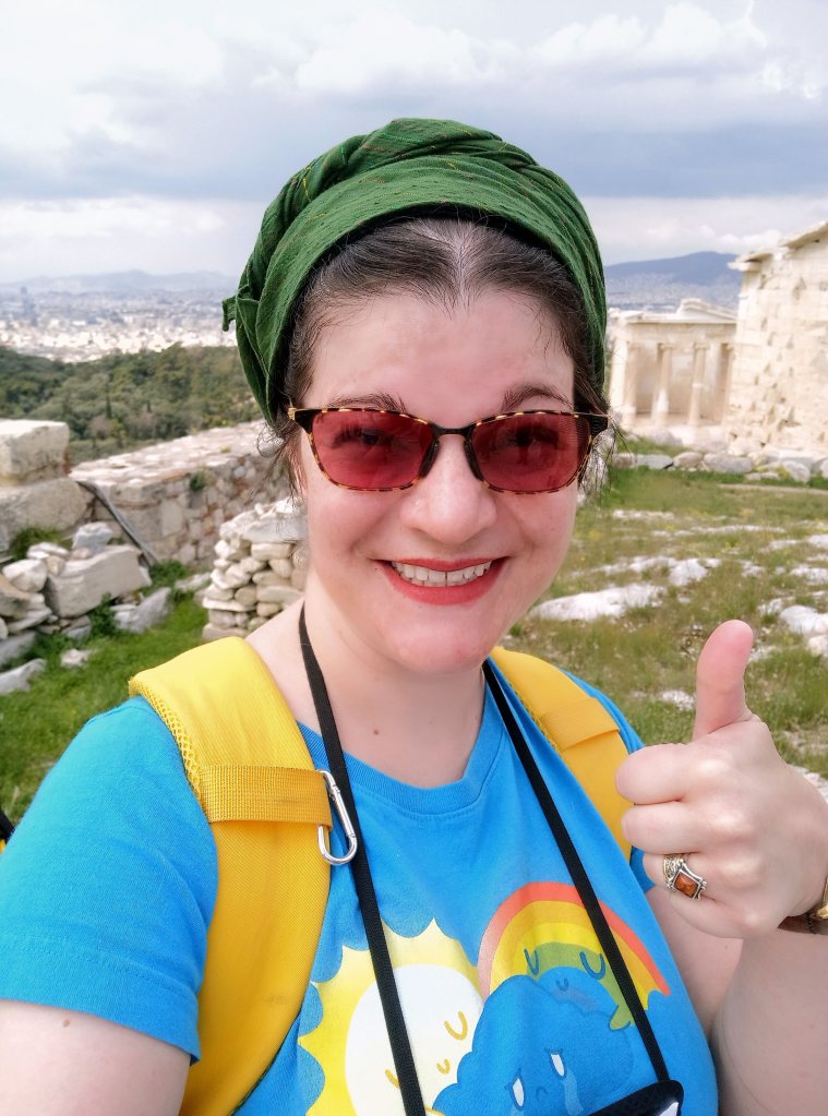 Here I am on the Athenian Akropolis with a bunch of students! The older donors were mildly curious about the scarves but satisfied with the ‘hair jail’ explanation. It’s windy in Greece. I broke down and saved up for a Cloud 9, and it changed my life.