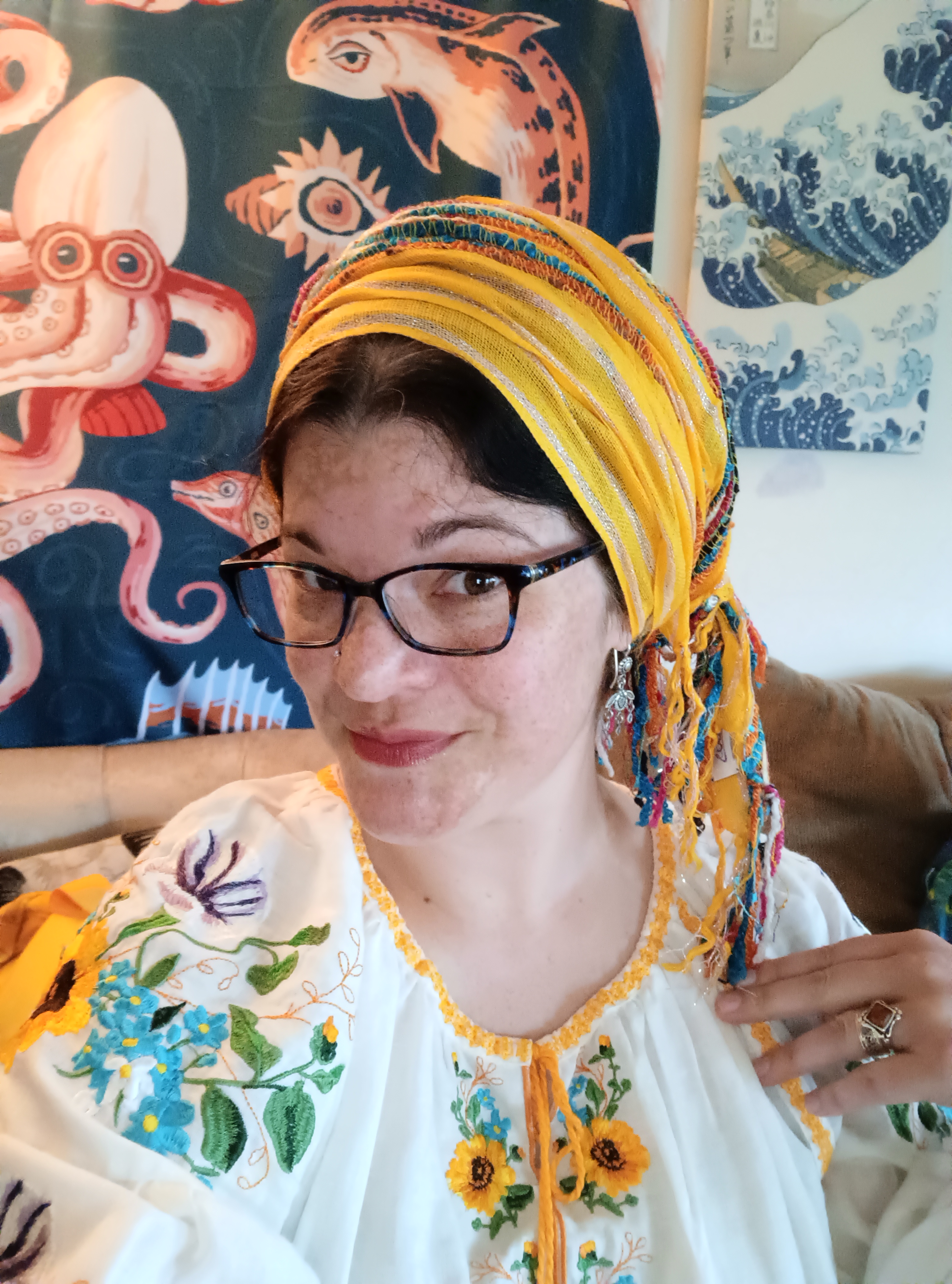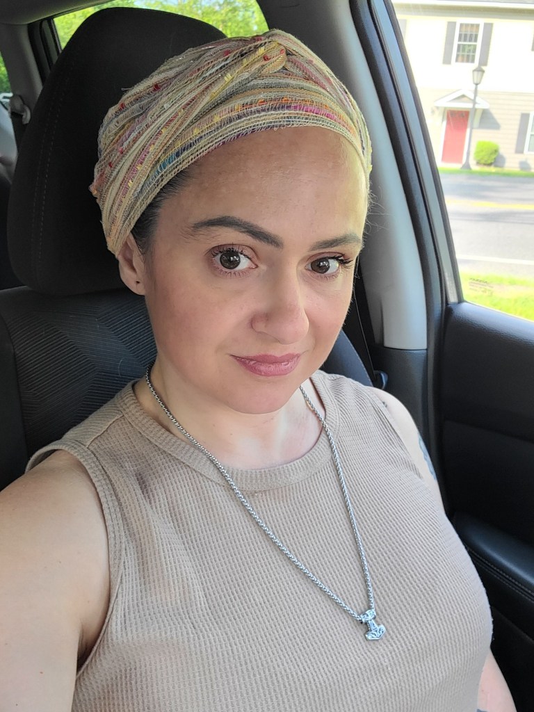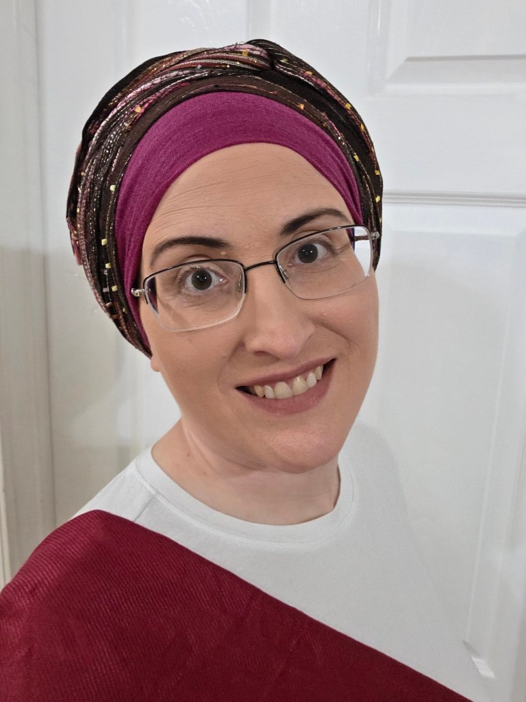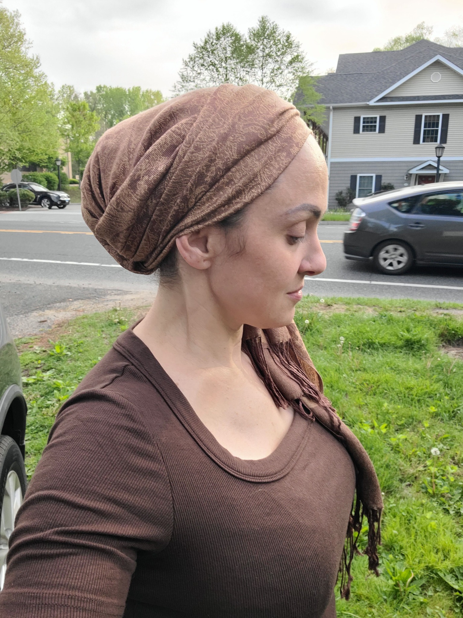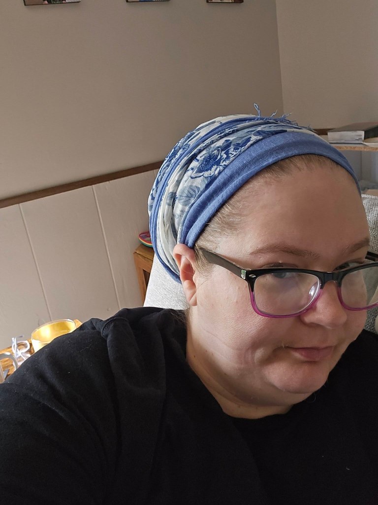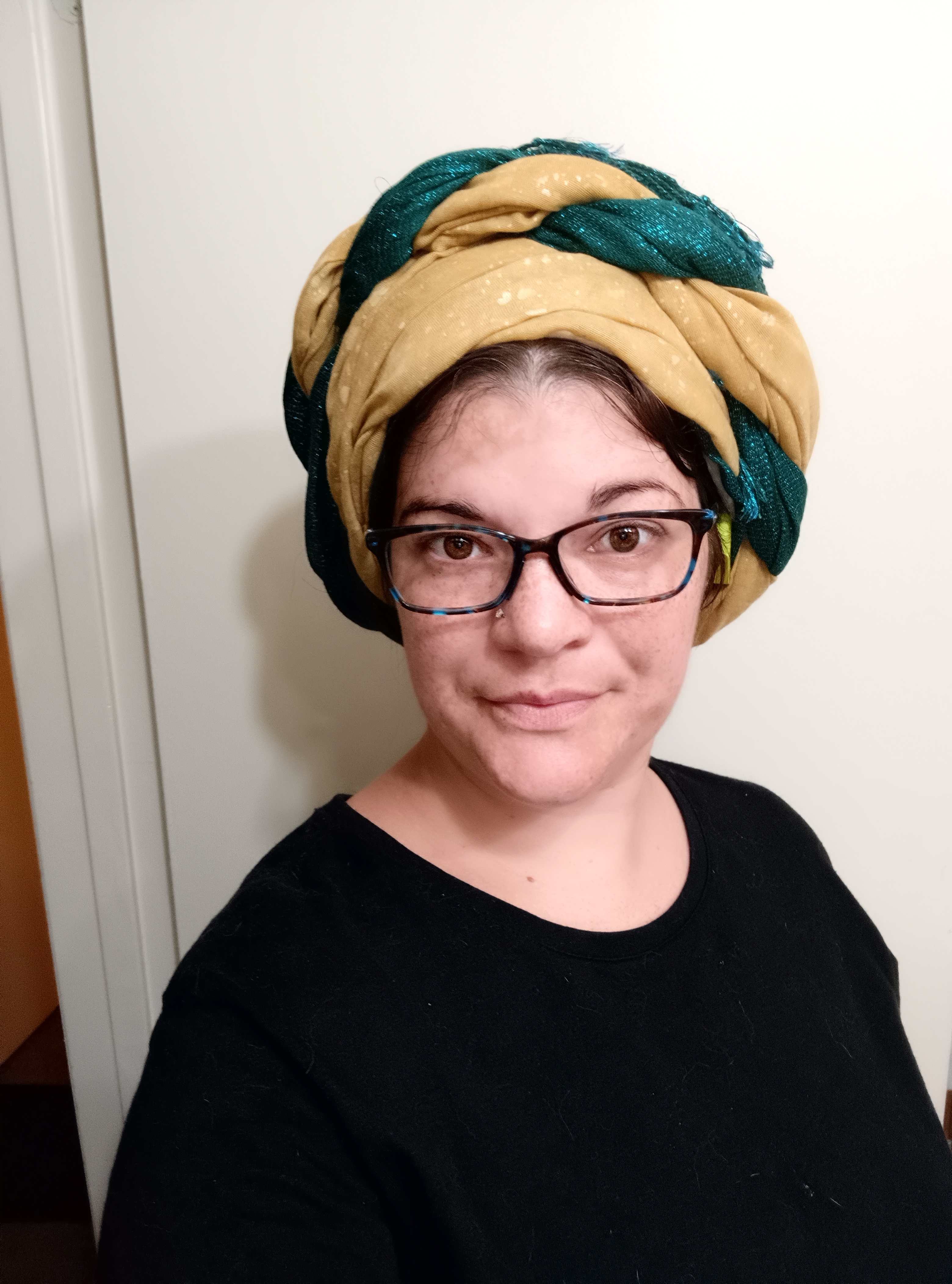 Here began the part-time covering; kerchiefs on some days, and every now and then I’d have my hair out to throw people off the scent. Then, as Lent 2024 approached, I decided it was time to test the waters. Wrapunzel had been on my radar for a while because a Facebook friend wears tichels and I quietly bookmarked the blog as soon as I saw it about a decade ago. I didn’t feel ready for a whole shaper (eek! A pouf!), but I dipped my toes in the water with some inexpensive pre-ties. And then, I decided to try wrapping for Lent. 40 days – I couldn’t destroy my whole social life in 40 days, surely? Hopefully,my student evaluations wouldn’t take a sudden dive because my students felt I looked too eccentric or religious.