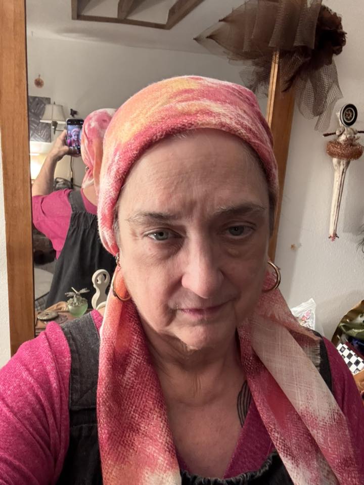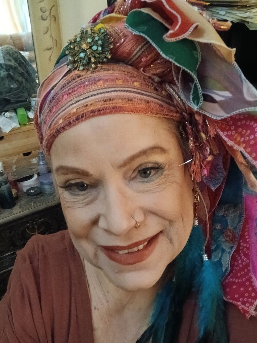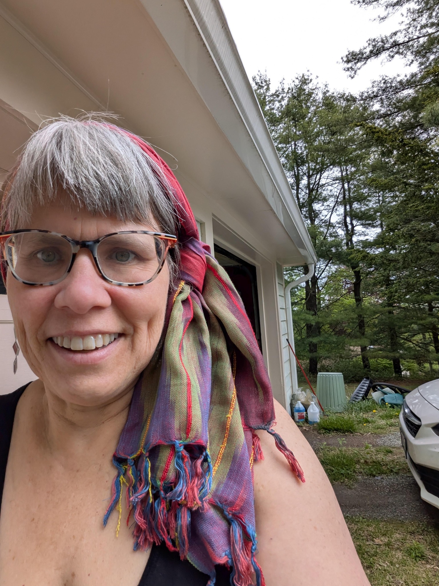 Already things are looking up. It’s just another kerchief with barettes, but that stupid long dangle of hair is out of my nostril!