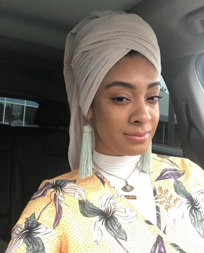 At the other end of the spectrum, we have the triumphant return of Jasmin and her stunningly glamorous shimmery wrap! This seemingly effortless (it’s not as complex as it looks, I swear!) and creative style is perfect for the woman who loves intricate-looking wraps without tails (myself included).