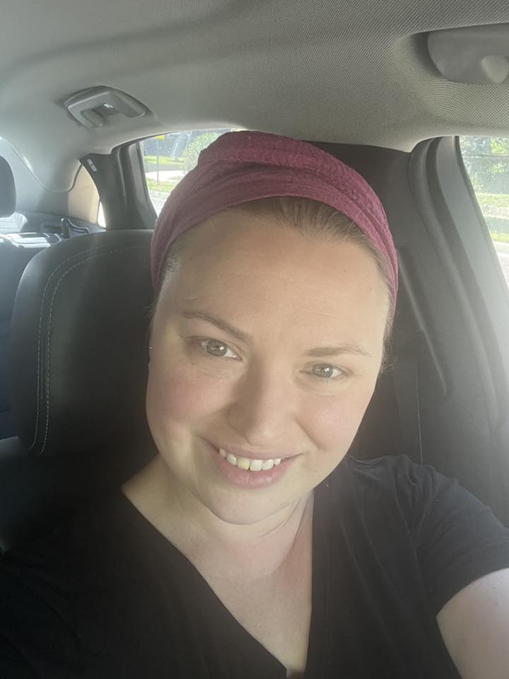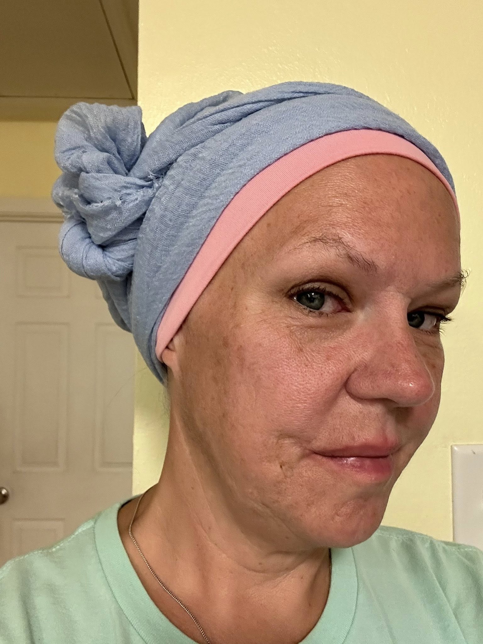 Ah yes, here we are trying to do a bun wrap without a bun or a shaper and feeling like we might have a defective skull. But I already look happier; this might be my first head hug.
