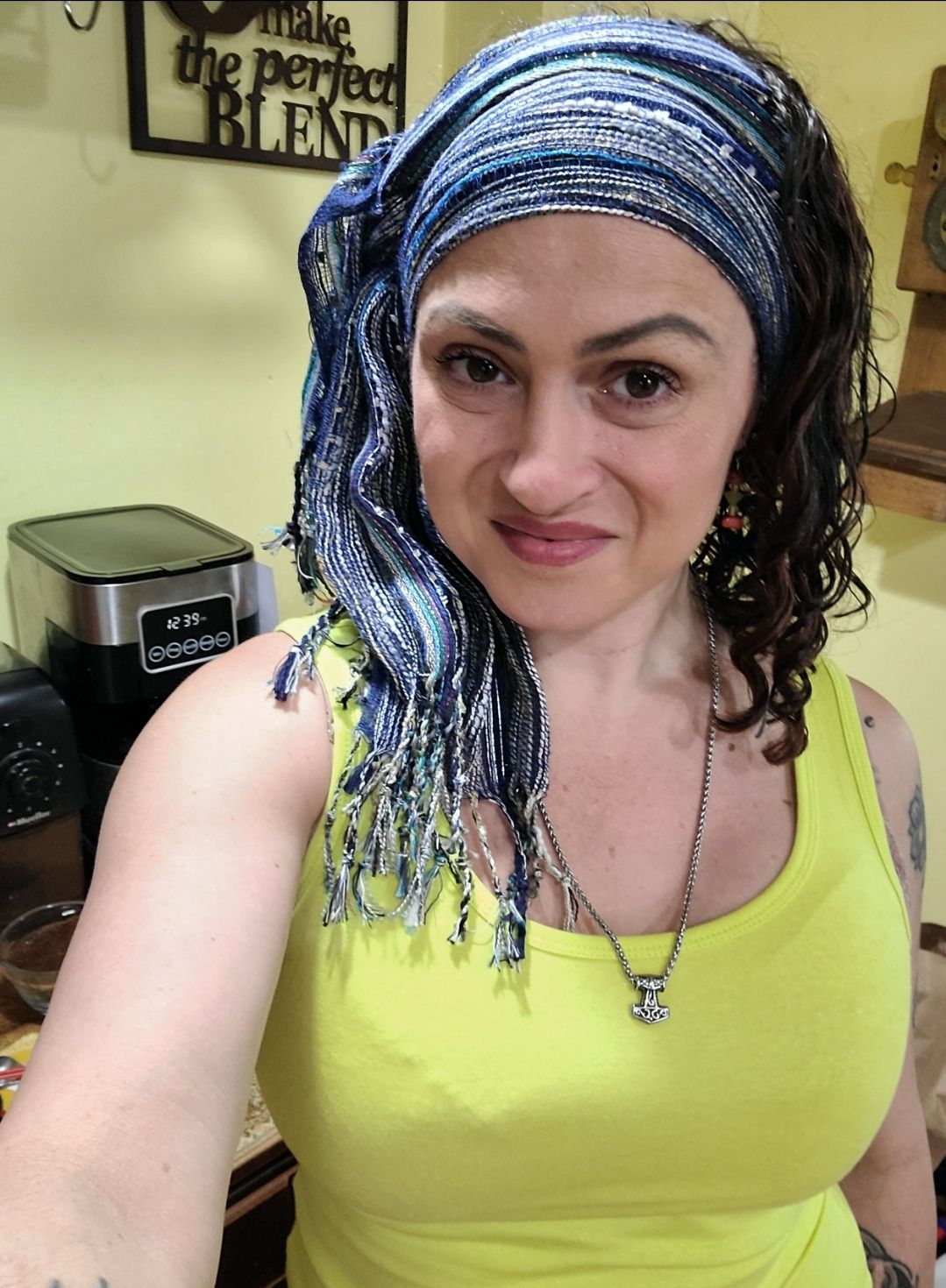 My first go-to tichel! Rainbow threaded Green Israeli tichel. I was struggling to get the long tails/ tucked back look with a DIY shaper. I was so sure I could craft my way to victory.