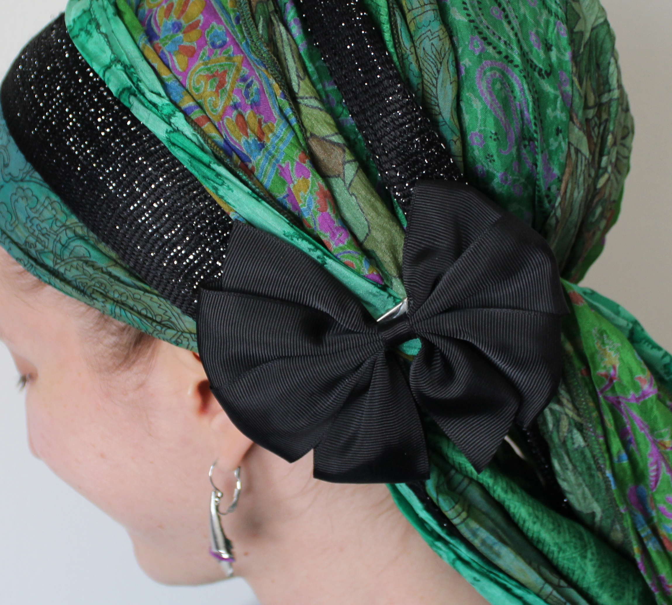 So, where did I start? Well, given that any color can go with black, I had a totally blank canvas- one that almost anything in my extensive tichel-wardrobe would match. This might sound like a good thing, but I felt totally intimidated and had no clue which direction to go! Alas, I had to start somewhere and my first attempt was what is almost always my fancy outfit go-to: The Shimmery. I tried a Layered Waterfall Twist using blues… then pewter and black… and then mulberry. Yet, they all felt too “loud” to go with this dress. Liking the idea of something sparkly, I moved on to my trusty green Shiny-licious, tied in a Chignon. While the green did then inspire other parts of my outfit, the scarf itself still felt like it was too much and did not match my rather subdued pre-Pesach mood.