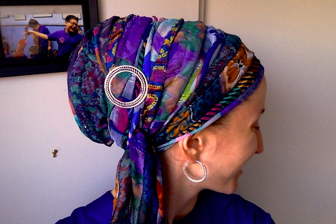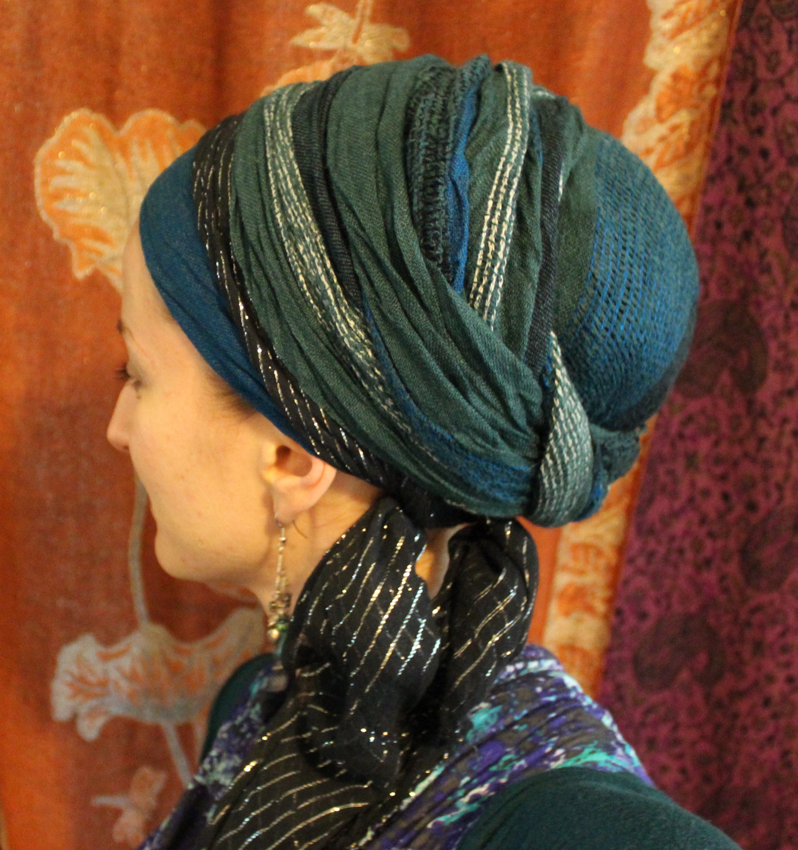 andrea grinberg wrapunzel tichelThis scarf was delegated as a curtain because I previously thought it was too thick to wrap well.  Since moving, the pashmina “curtains” were taken down, and I decided to try wrapping it on my head!  I don’t think this will going back to being a curtain any time soon 🙂