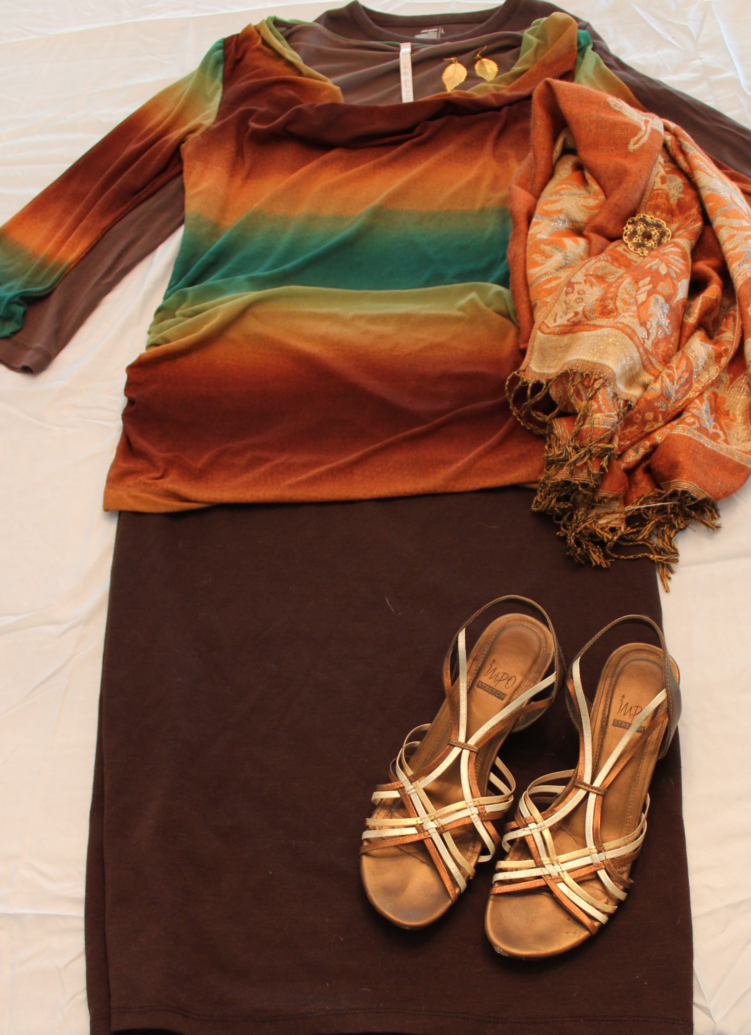 But I digress.  Here is outfit #1!  Often for my outfits, I pick the scarf first (because obviously that’s what I love choosing the most), but in this instance, the shirt was one I had been wanting to wear for a while, so that was picked first.  The brown skirt and layering shirt were easy choices, and the orange and gold scarf matched the shirt perfectly!  Even though the scarf has silver threads in it, the gold earrings and pin were a good match.  I could have easily added a green sash to the scarf wrap as well.