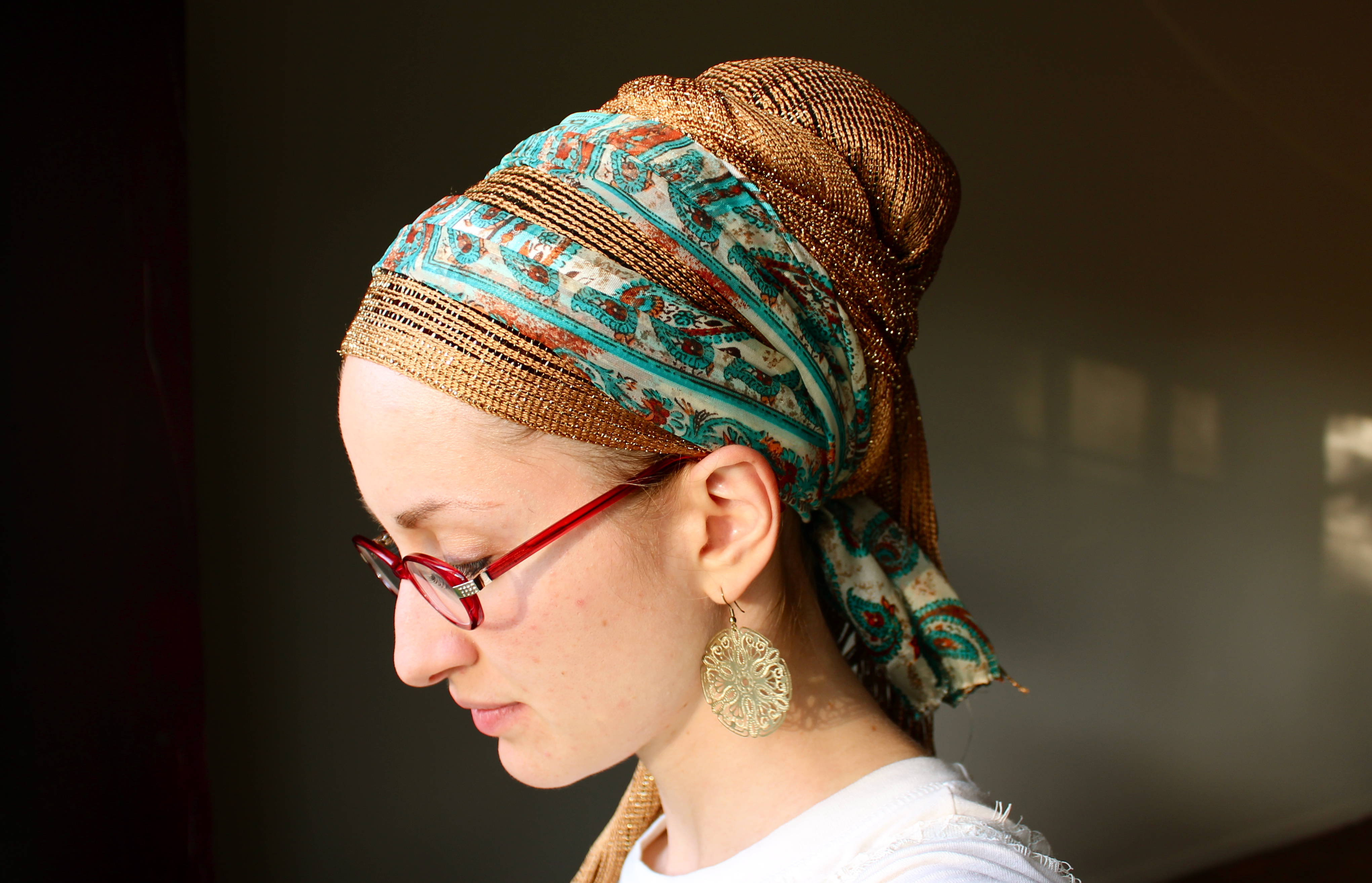 I could also title this particular photo, why I can’t wear baby pink, but Andrea can. Why? Well, although I’ve got a cooler hue (which supposedly allows for baby pink) my skin tone is too dark for that color. Baby light pink blends in with my skin tone and my hue. Monochromatic skin and tichel schemes are always a VERY BAD IDEA. (Please note: there is no photo to portray this particular issue. Although I love Wrapunzel, even I am not willing to sacrifice that much of my vanity. Moving on…) Andrea is an ashy blond and her skin falls in a totally different skin tone category from mine. So, she can wear those lighter, cooler colors whereas I’ll become instantly jaundiced.